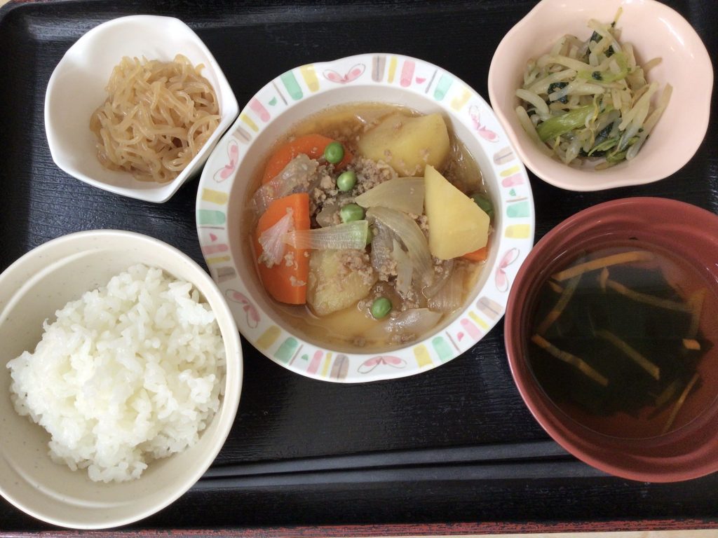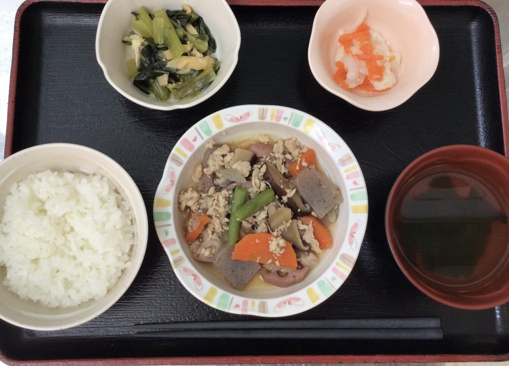 【昼食】 1.米飯 2.なすの肉みそ炒め 3.うの花サラダ 4.大根のくず煮 5.すまし汁