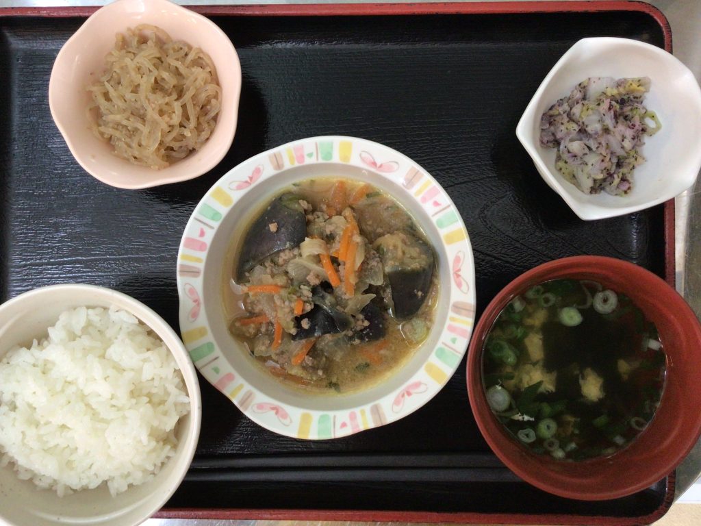 【昼食】 1.米飯 2.なすの肉みそ炒め 3.白菜ゆかり和え 4.糸こん甘辛煮 5.すまし汁