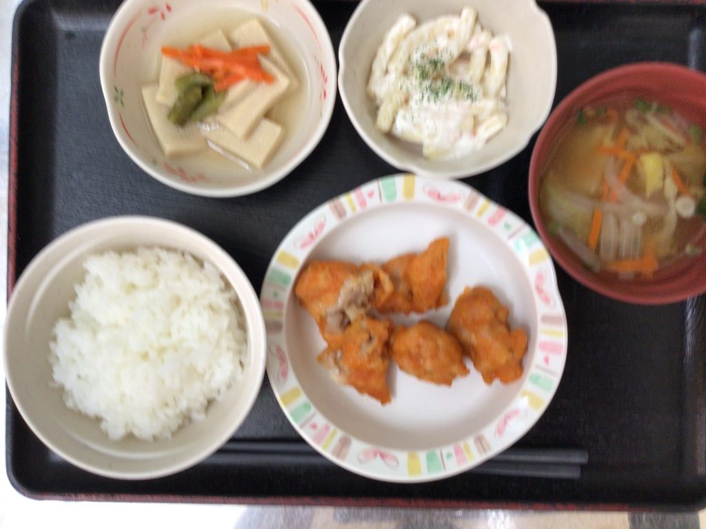 【昼食】 1.米飯 2.鶏唐揚げ 3.高野の短冊煮 4.マカロニサラダ 5.みそ汁