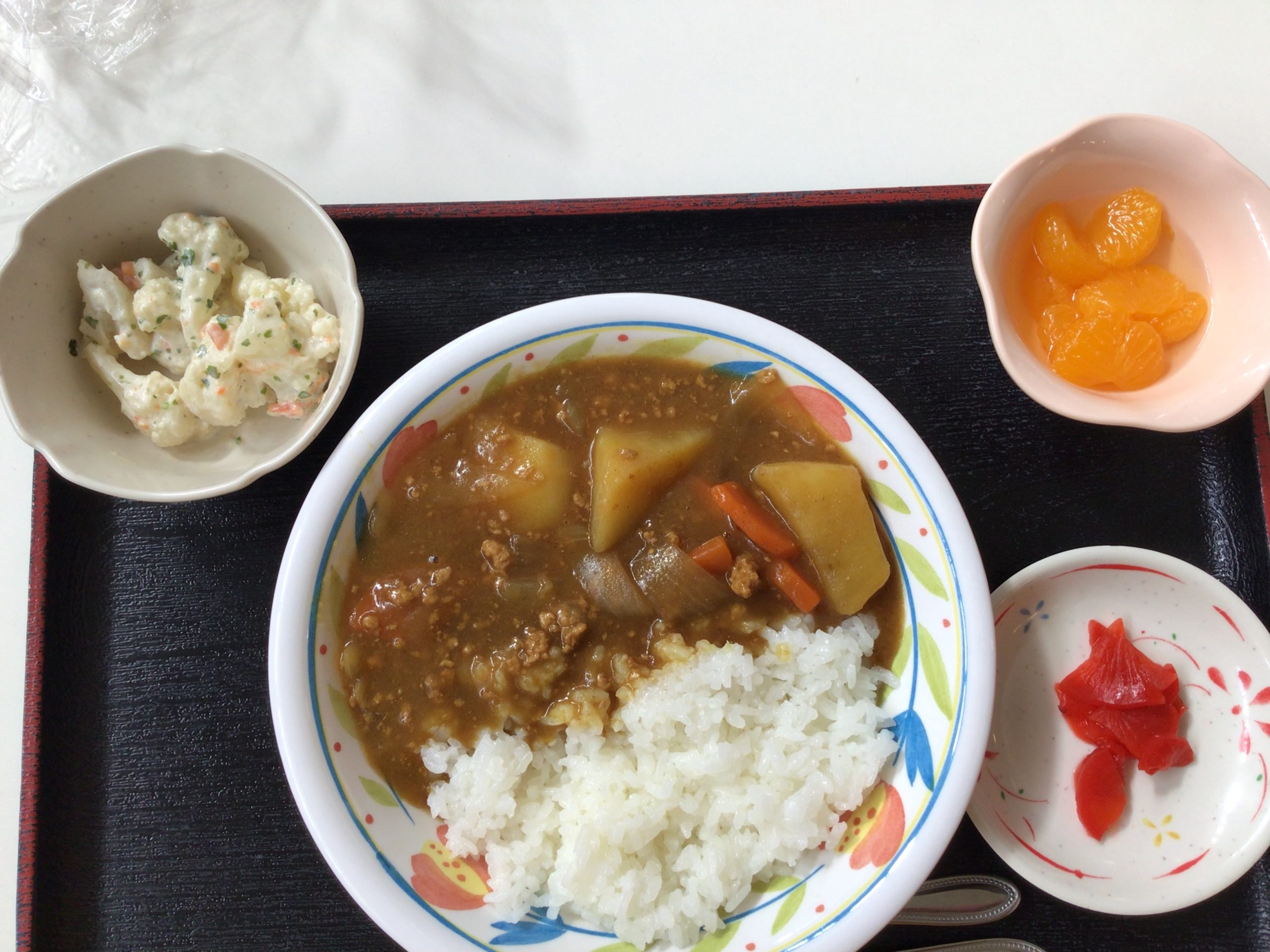 【昼食】 1.カレーライス 2.福神漬け 3.カリフラワーのりマヨネーズ 4.フルーツ缶 669kcal 蛋白質14.1g 脂質19.8g 食塩2.1g