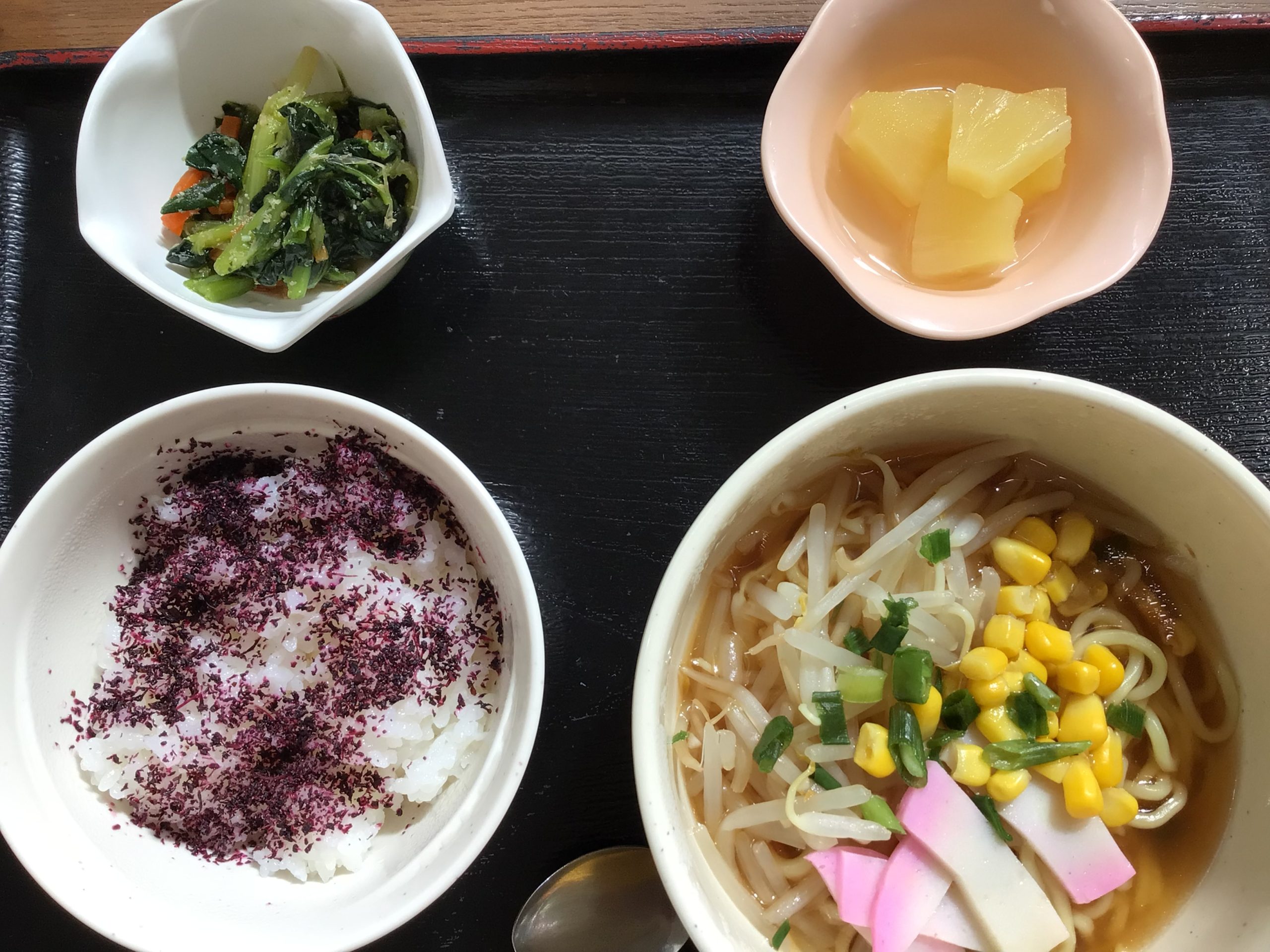 【昼食】 1.ゆかりご飯 2.醤油ラーメン 3.ナムル 4.フルーツ缶 532kcal 蛋白質11.7g 脂質3.7g 食塩1.0g
