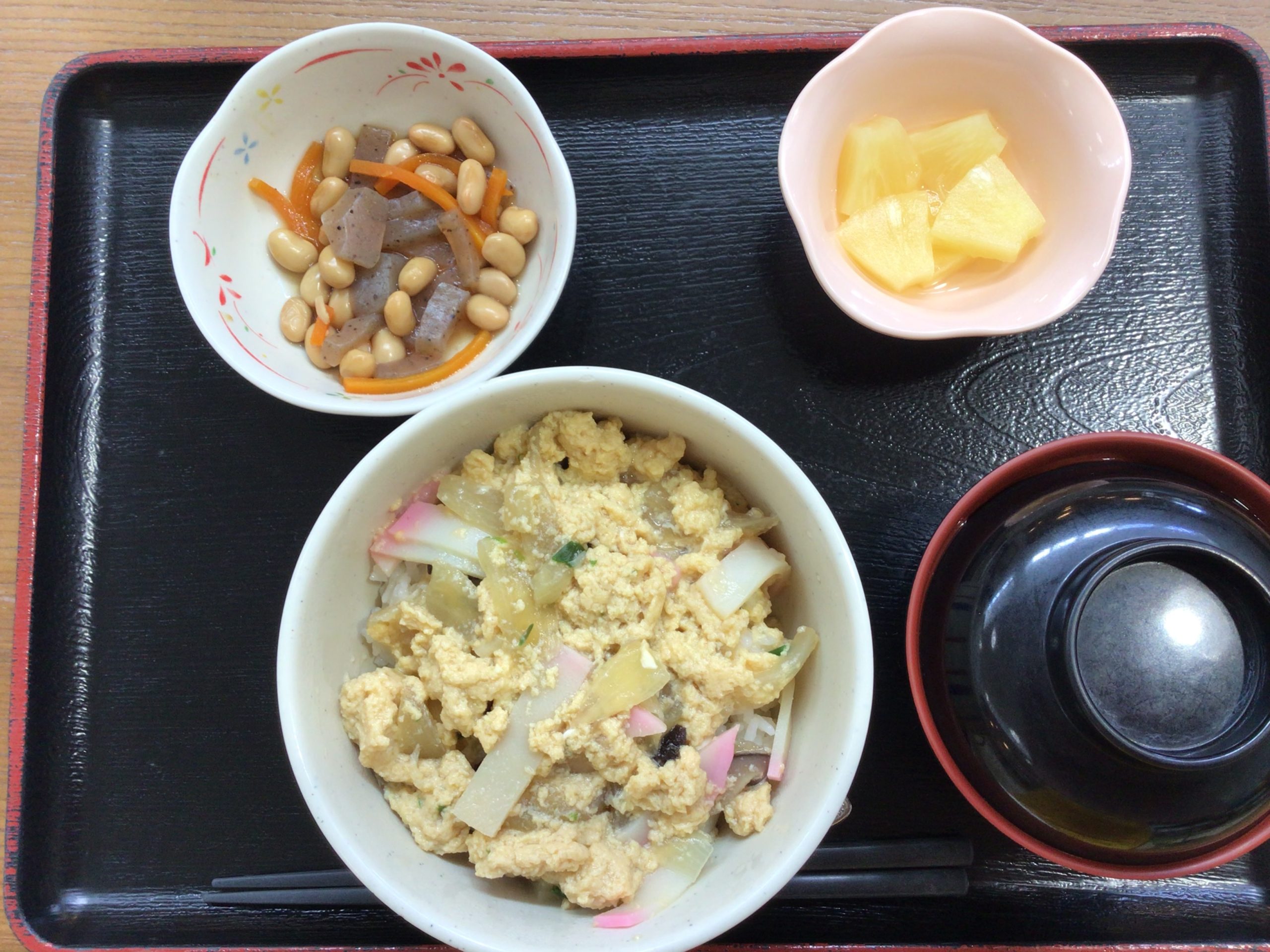【昼食】 1.木の葉丼 2.大豆の煮物 3.フルーツ缶 4.すまし汁 558kcal 蛋白質18.1g 脂質7.5g 食塩4.6g