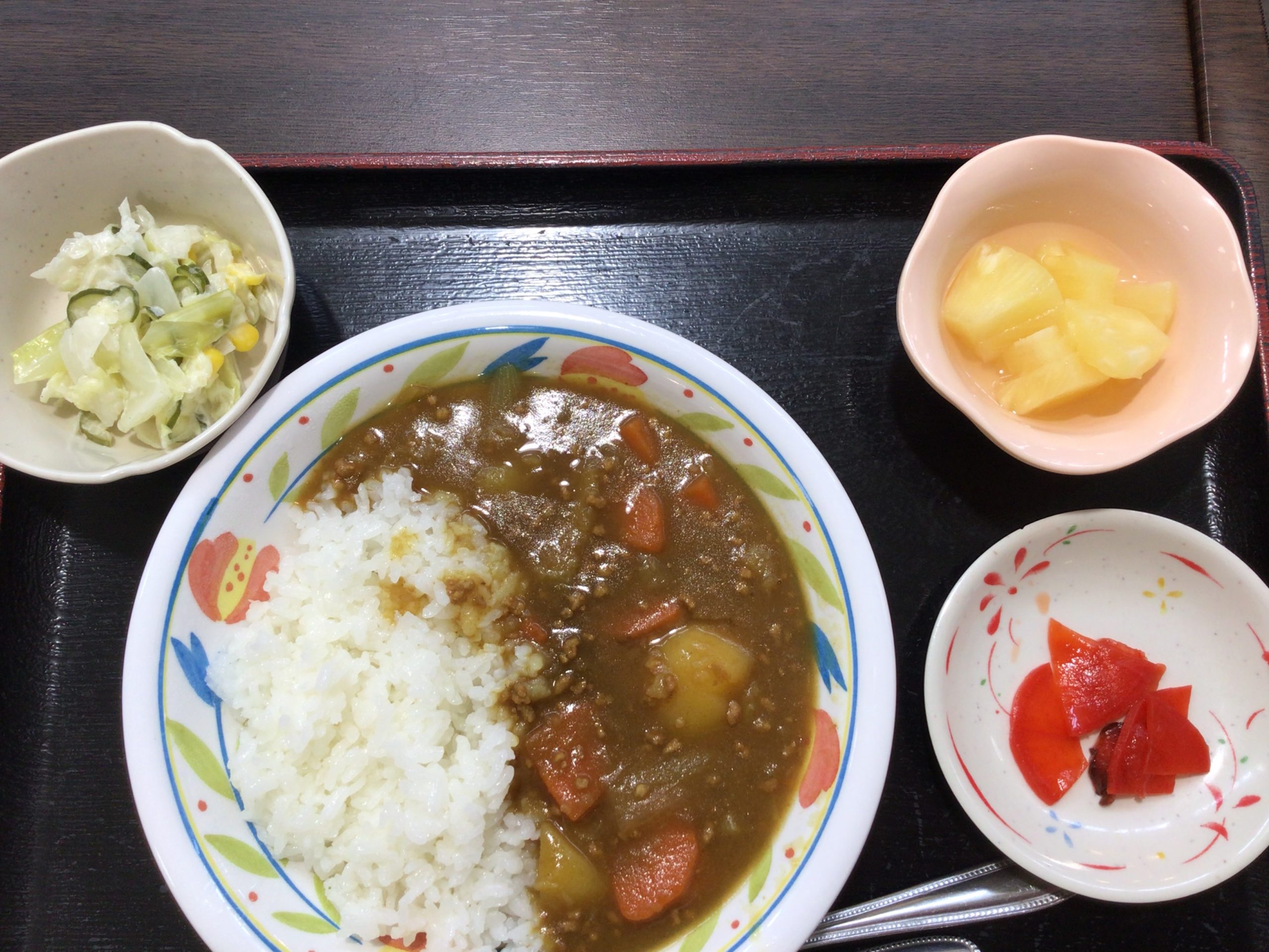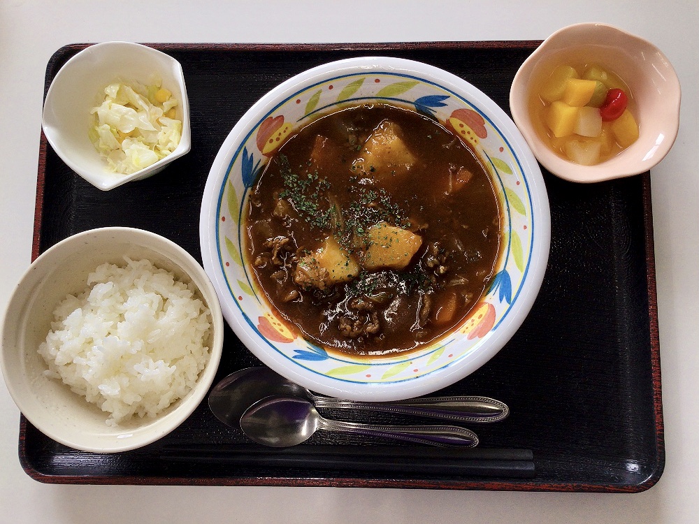 【昼食】 1.カレーライス 2.コールスローサラダ 3.フルーツ缶 732kcal 蛋白質14.4g 脂質25.1g 食塩2.4g