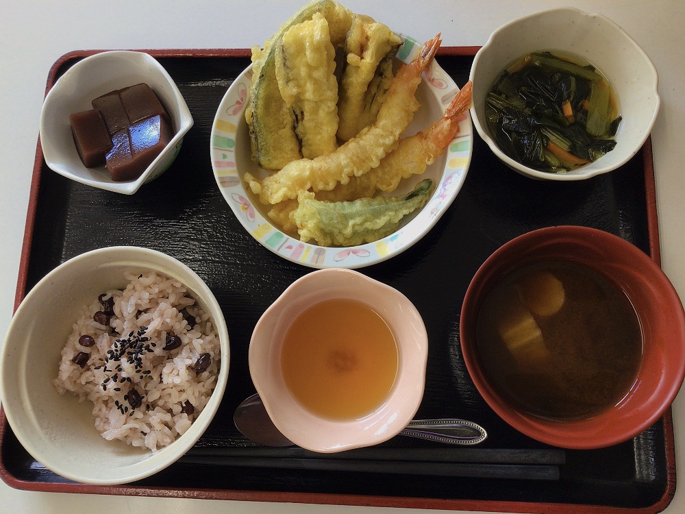 【昼食】 1.赤飯 2.天ぷら盛り合わせ 3.小松菜煮浸し 4.赤だし 5.デザート 519kcal 蛋白質20.1g 脂質1.9g 食塩4.5g