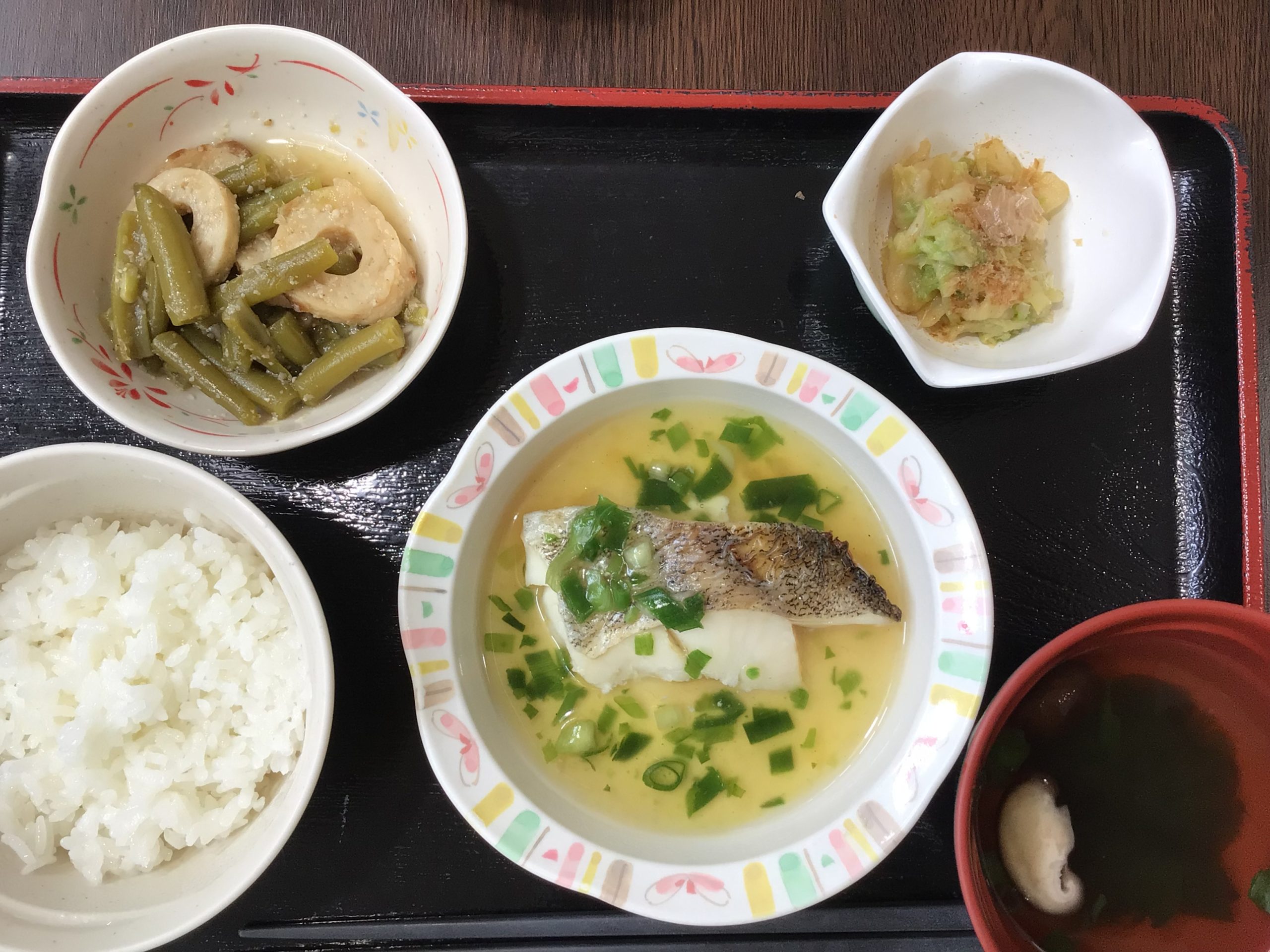 【昼食】 1.米飯 2.白身魚のあんかけ 3.いんげんと竹輪煮 4.白菜お浸し 5.すまし汁 478kcal 蛋白質19.8g 脂質2.7g 食塩3.6g