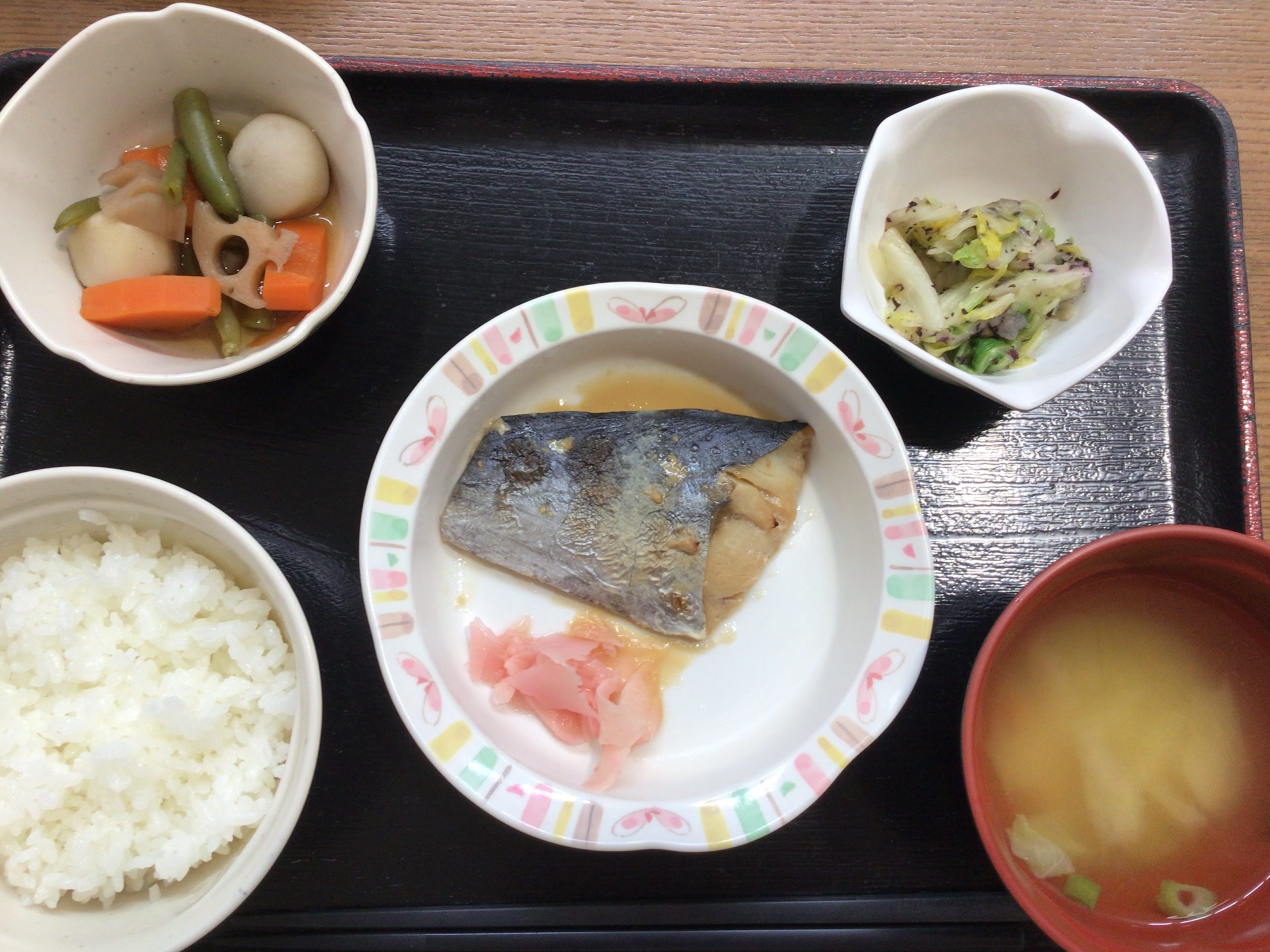 【昼食】 1.米飯 2.さわら柚庵焼き 3.ごった煮 4.白菜ゆかり和え 5.みそ汁 545kcal 蛋白質21.1g 脂質7.2g 食塩3.0g