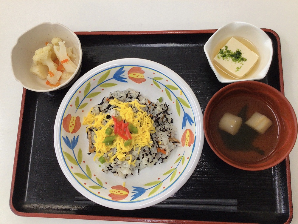 【昼食】 1.ひじきチラシ寿司 2.煮奴 3.カリフラワー甘酢和え 4.すまし汁 468kcal 蛋白質10.7g 脂質3.3g 食塩3.8g