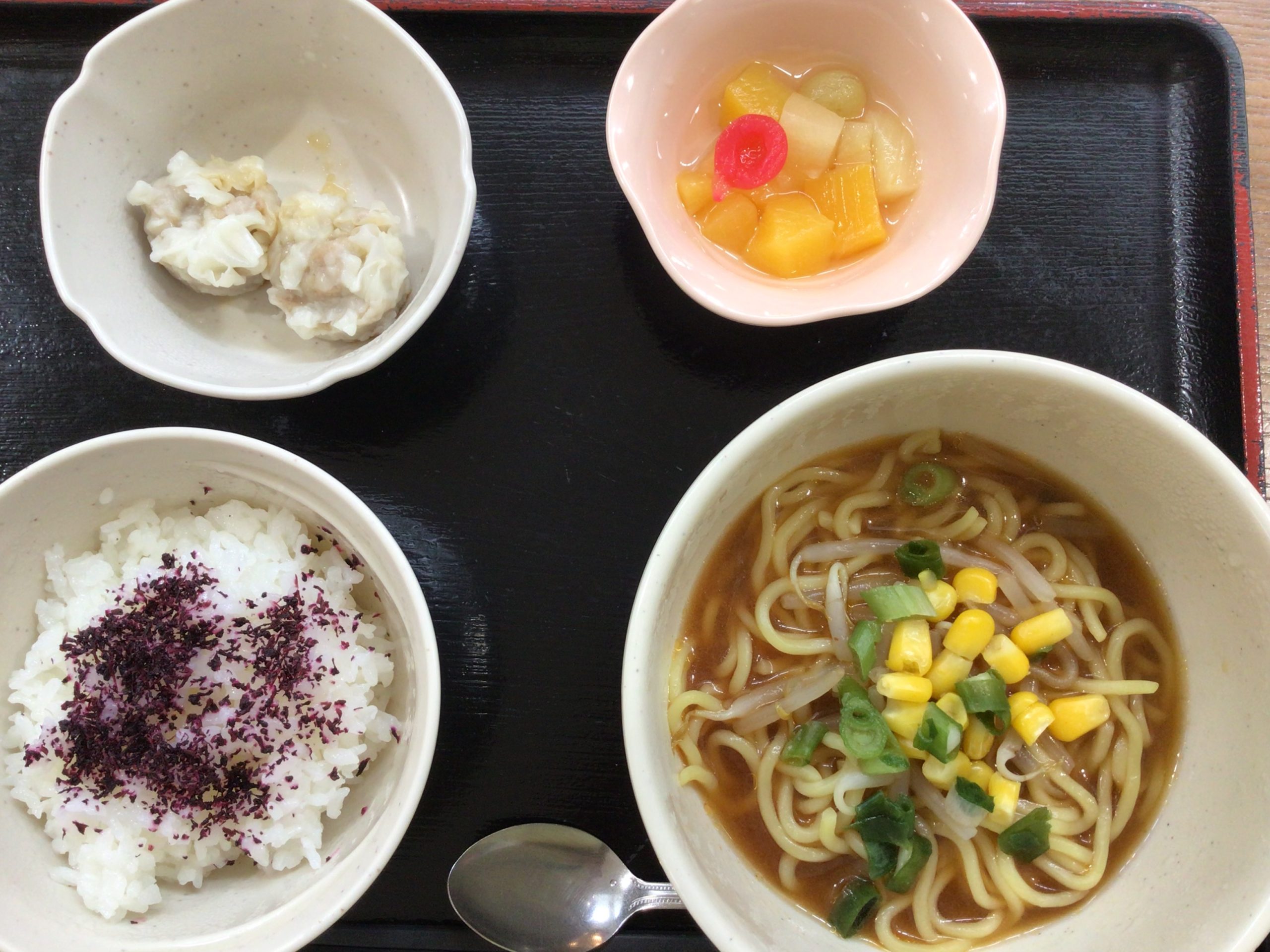 【昼食】 1.ゆかりご飯 2.味噌ラーメン 3.蒸シューマイ 4.フルーツ缶 549kcal 蛋白質12.6g 脂質4.5g 食塩0.7g