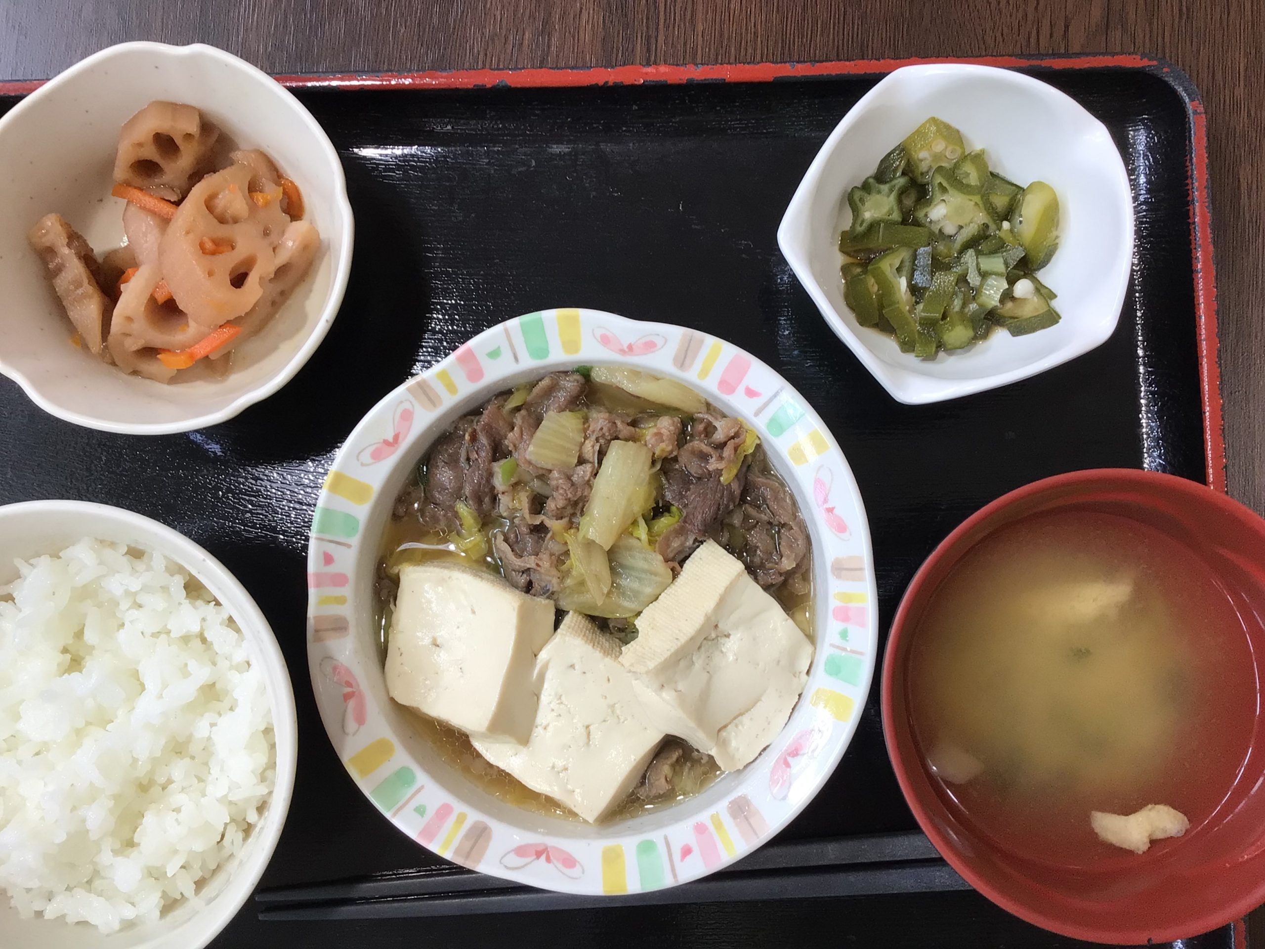 【昼食】 1.米飯 2.肉豆腐 3.れんこん炒め煮 4.おくらポン酢 5.みそ汁 576kcal 蛋白質20.0g 脂質8.6g 食塩3.2g