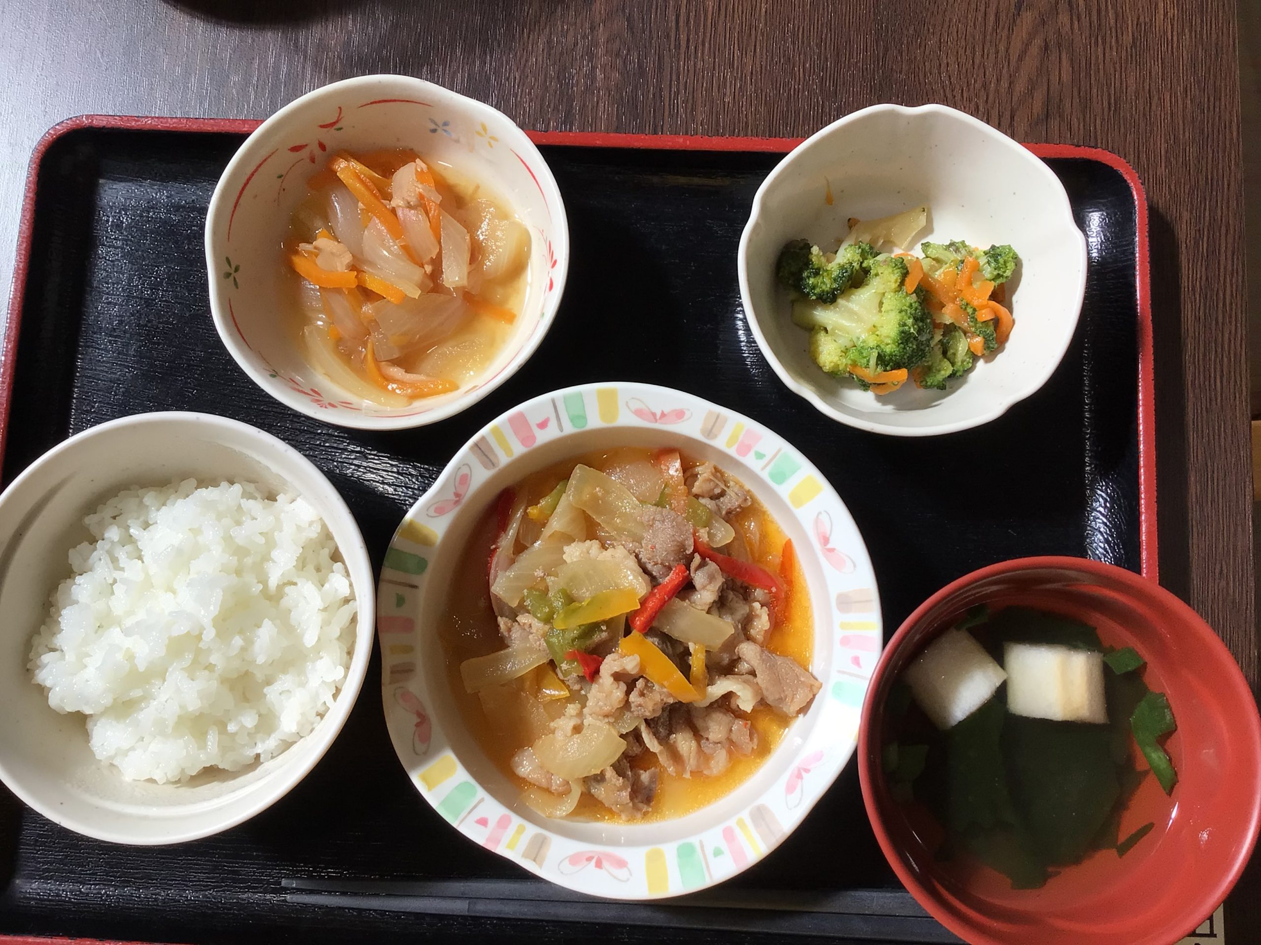 【昼食】 1.米飯 2.豚肉の生姜炒め 3.玉葱ツナ煮 4.ブロッコリードレ和え 5.すまし汁 588kcal 蛋白質18.5g 脂質11.9g 食塩3.8g