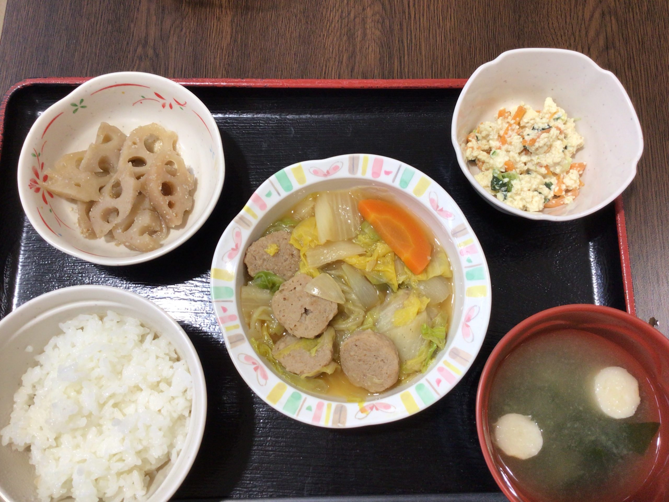 【昼食】 1.米飯 2.肉団子と野菜の煮物 3.しら和え 4.きんぴられんこん 5.みそ汁 597kcal 蛋白質15.7g 脂質9.3g 食塩3.7g