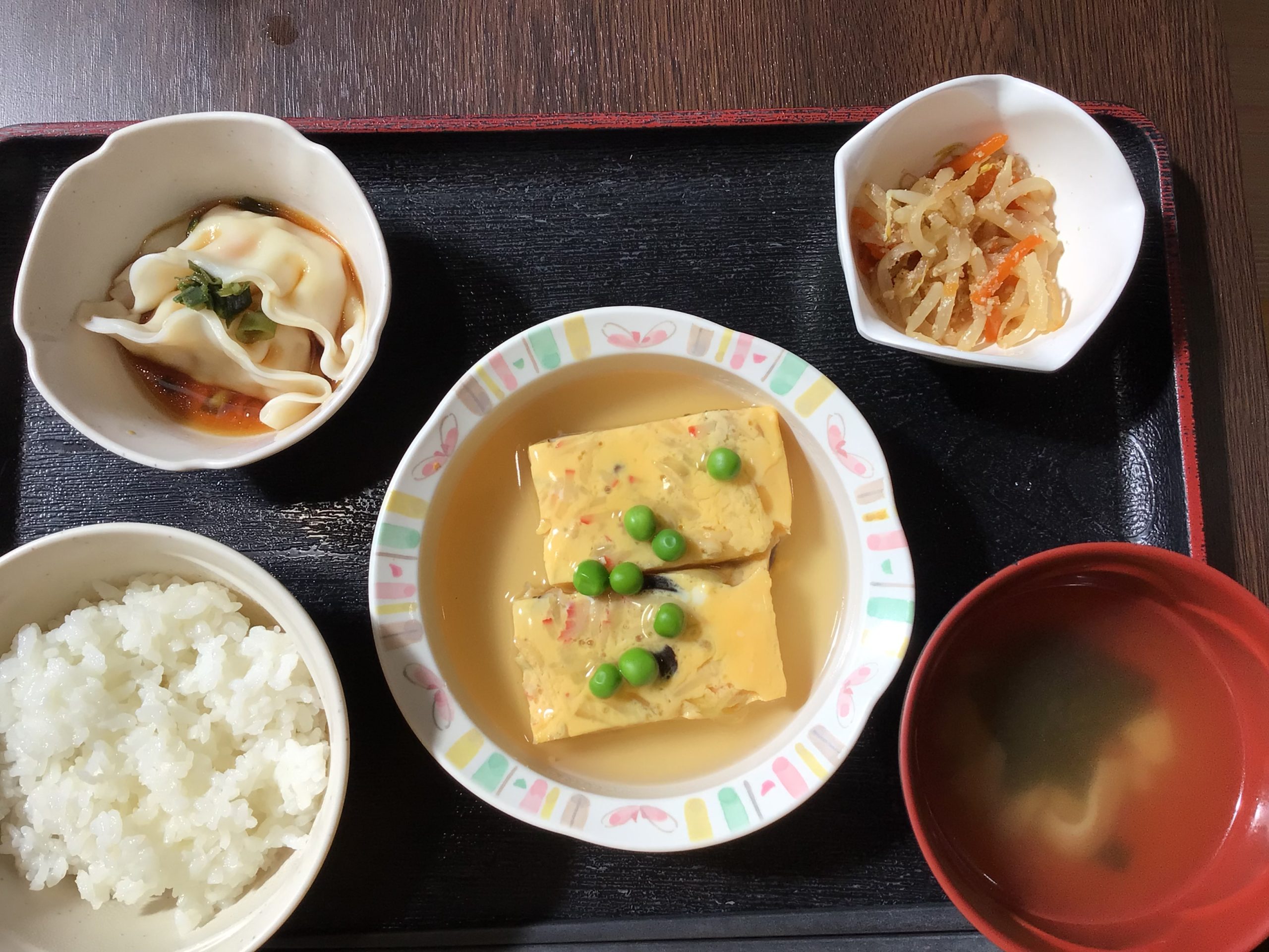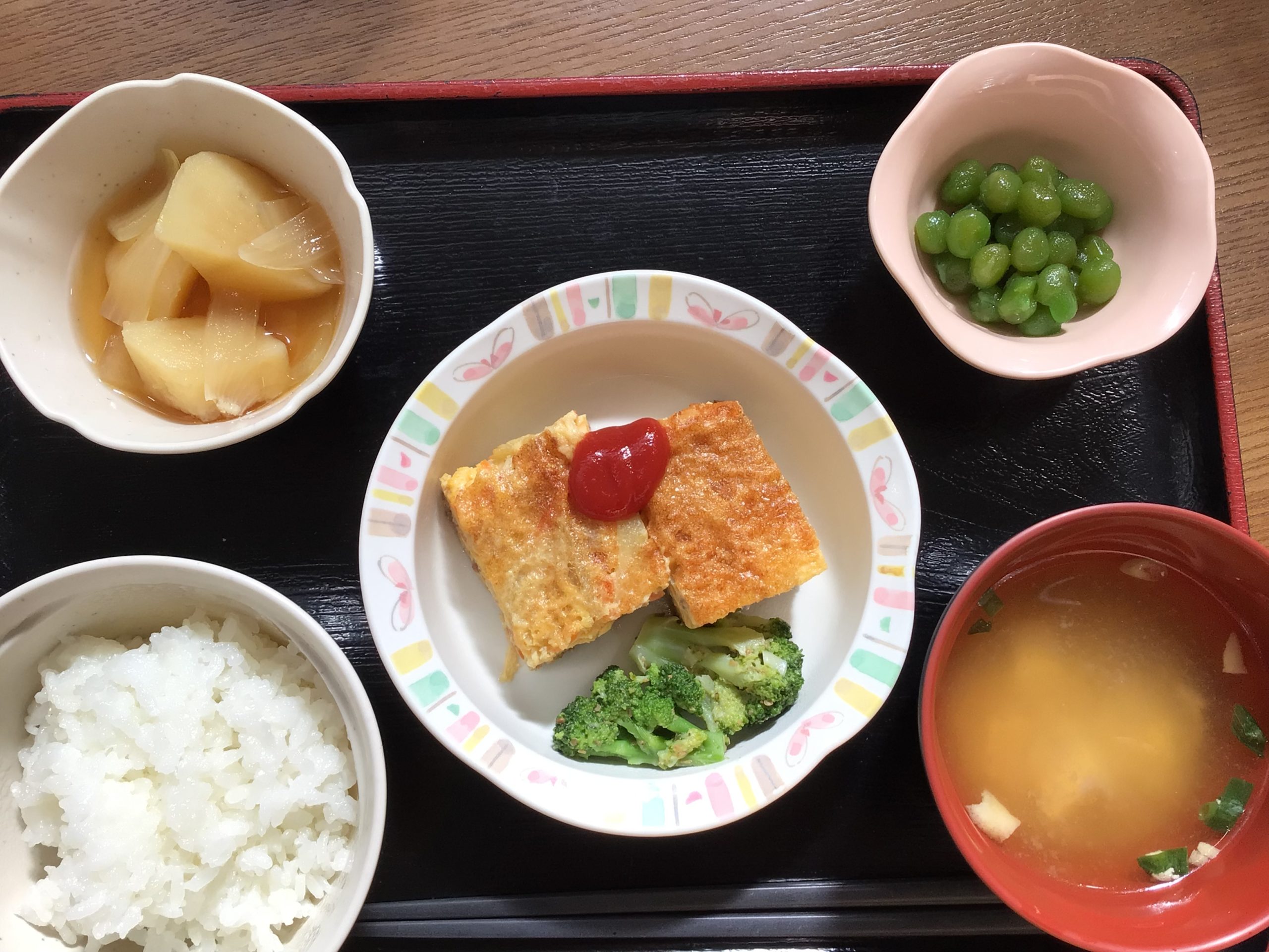 【昼食】 1.米飯 2.オムレツ 3.煮物(じゃが芋) 4.うぐいす豆 5.みそ汁 705kcal 蛋白質26.1g 脂質15.3g 食塩4.4g