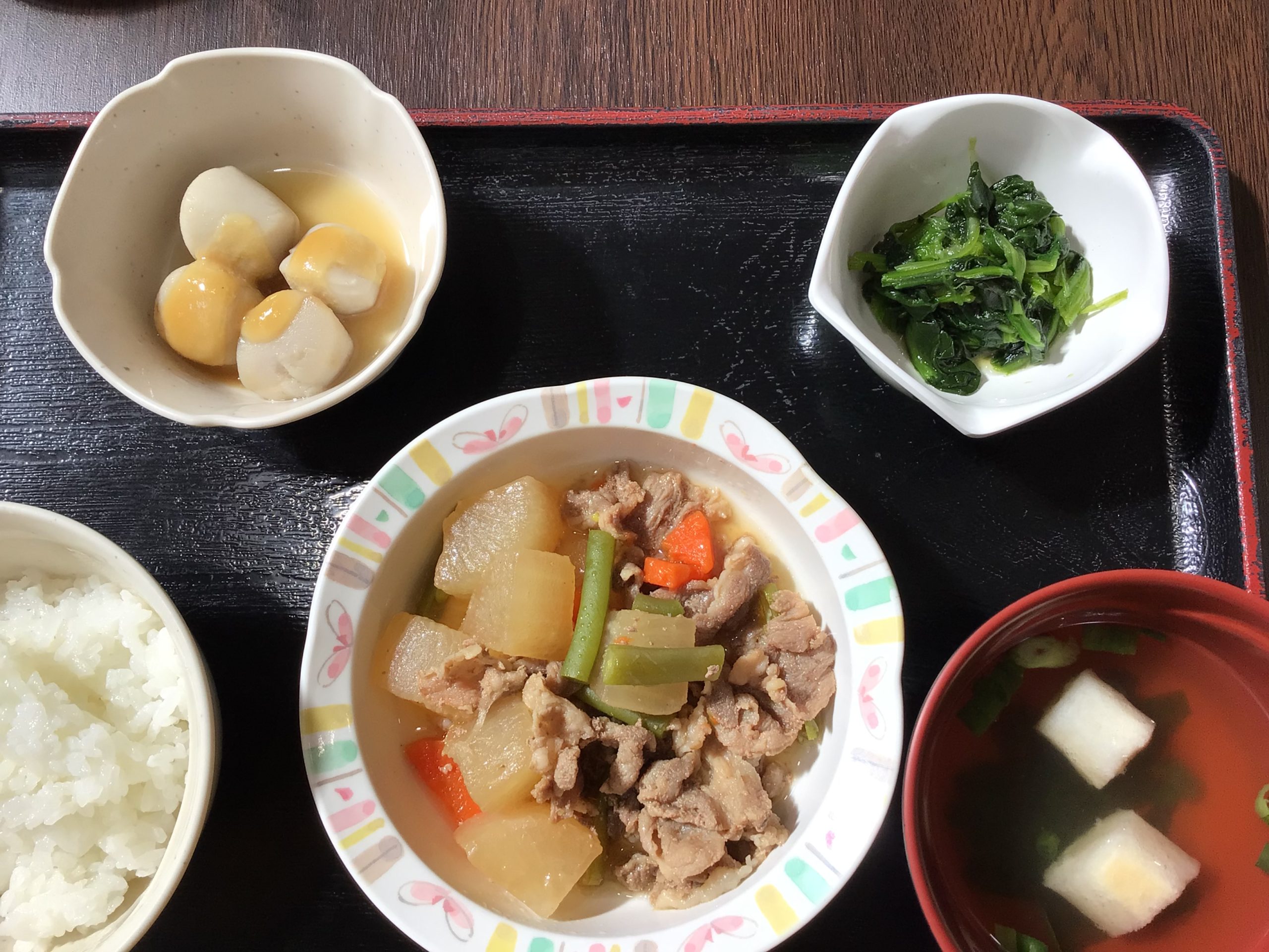 【昼食】 1.米飯 2.豚と大根の煮物 3.ゆず味噌和え(里芋) 4.ほうれん草のお浸し 5.すまし汁 548kcal 蛋白質17.8g 脂質8.8g 食塩3.6g
