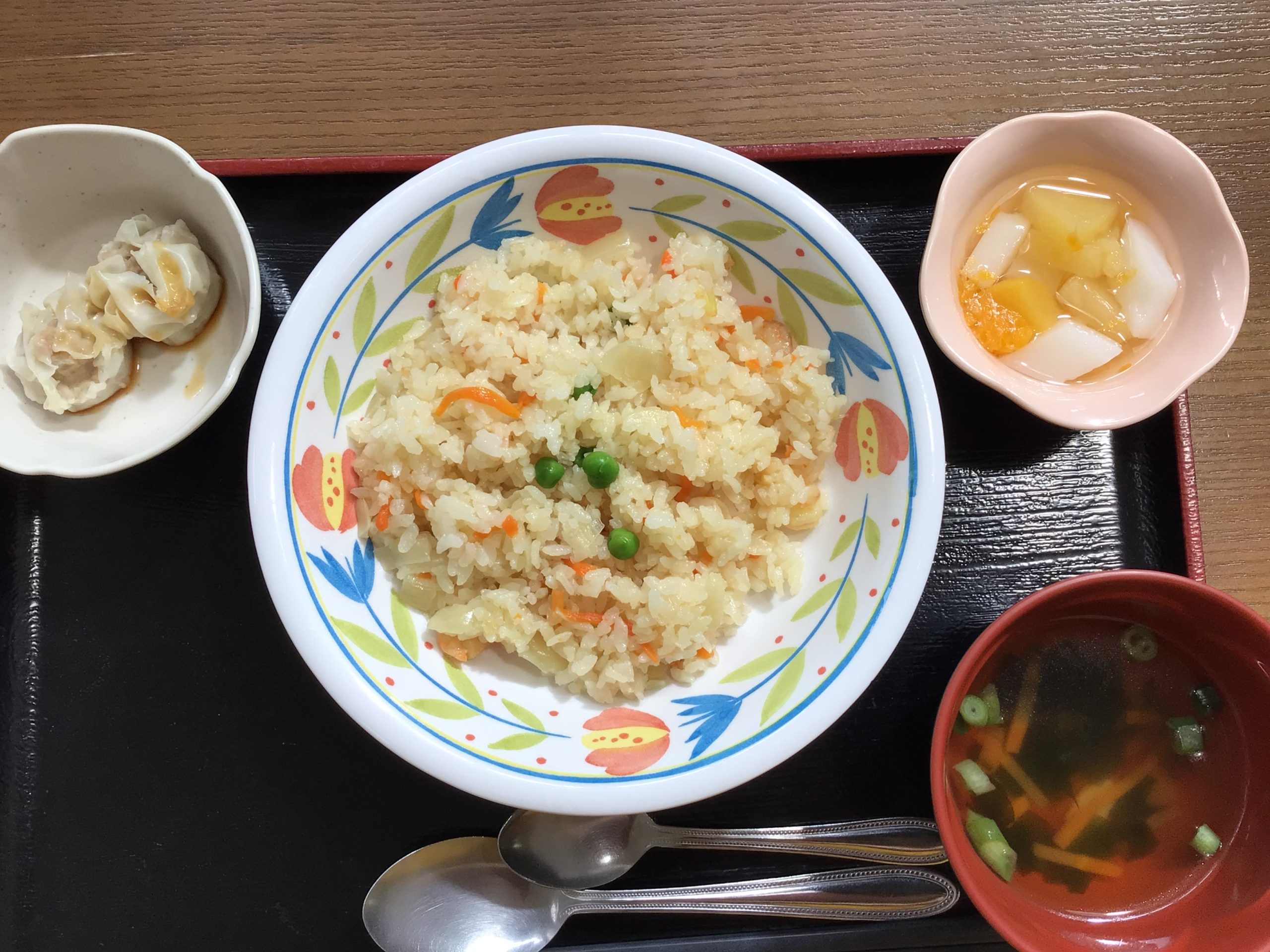 【昼食】 1.エビピラフ 2.蒸シューマイ 3.フルーツ杏仁豆腐 4.中華風スープ 495kcal 蛋白質15.7g 脂質6.8g 食塩1.6g