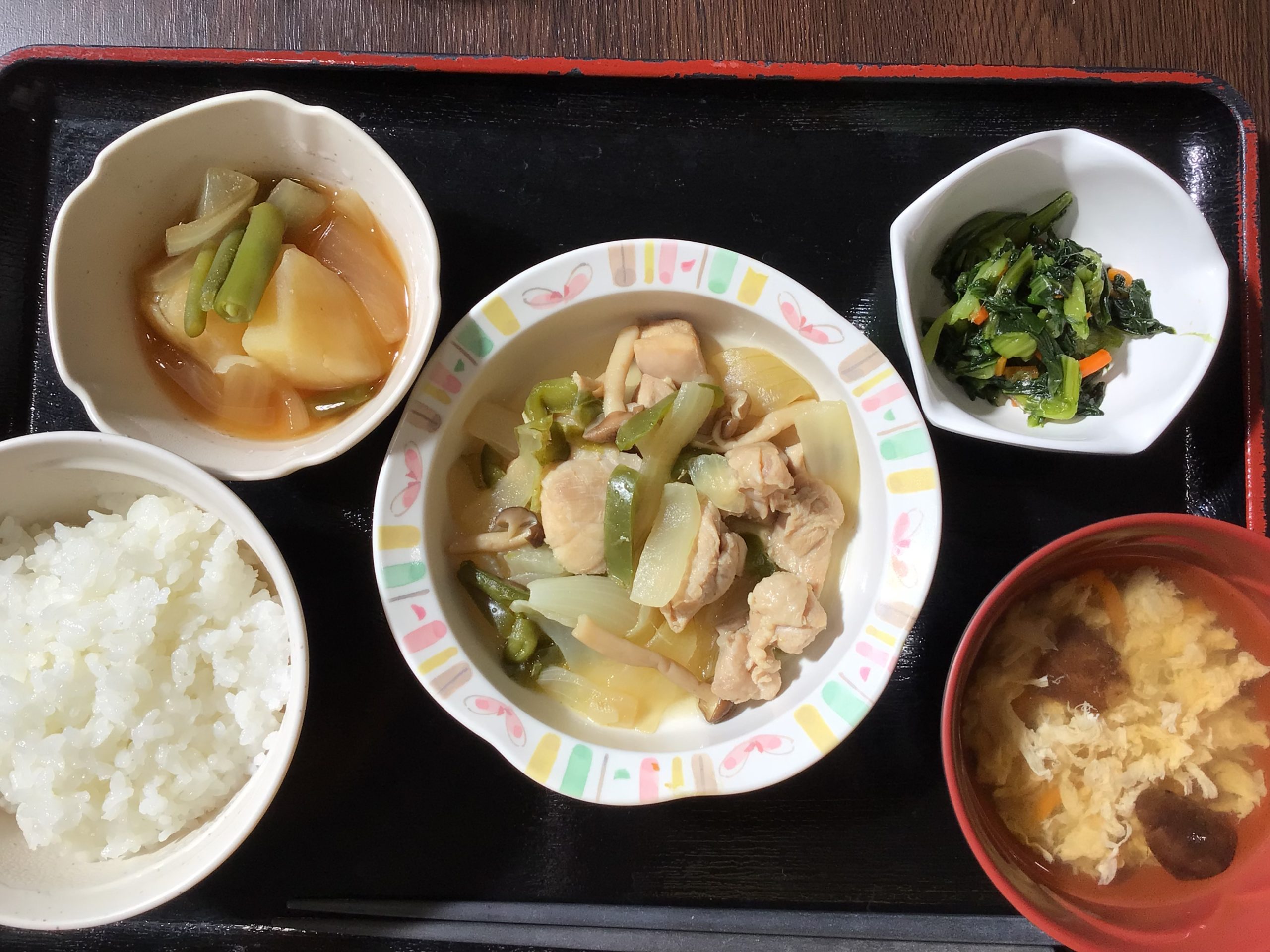 【昼食】 1.米飯 2.鶏の甘辛炒め 3.煮物(じゃが芋) 4.小松菜お浸し 5.すまし汁 570kcal 蛋白質17.6g 脂質10.5g 食塩4.1g