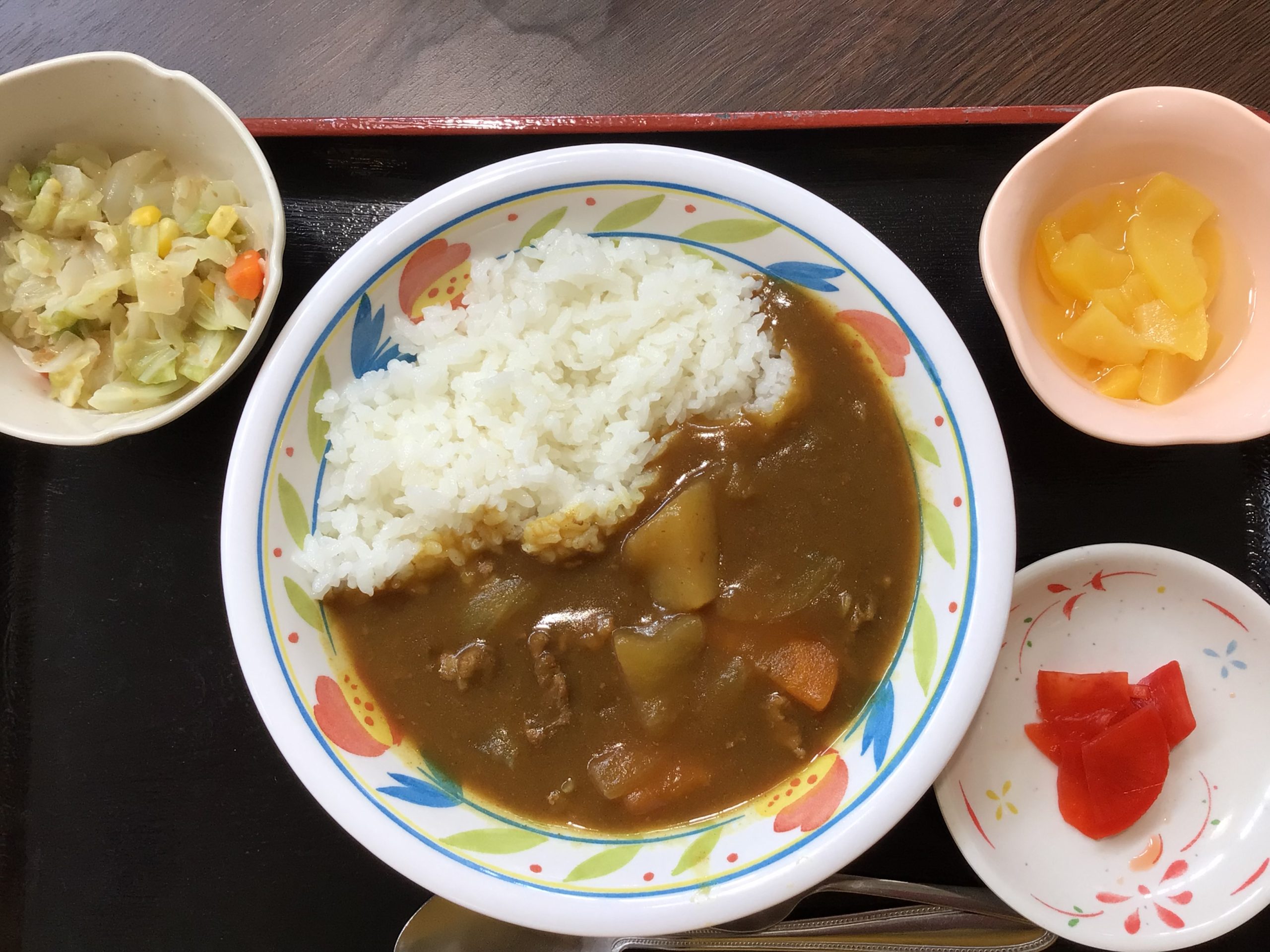 【昼食】 1.カレーライス 2.キャベツのサラダ 3.黄桃缶 633kcal 蛋白質15.2g 脂質13.9g 食塩2.6g