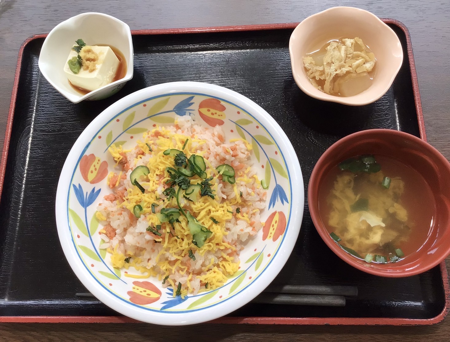 【昼食】 1.鮭チラシ寿司 2.とうがん煮 3.冷奴 4.すまし汁 517kcal 蛋白質17.4g 脂質6.1g 食塩3.7g