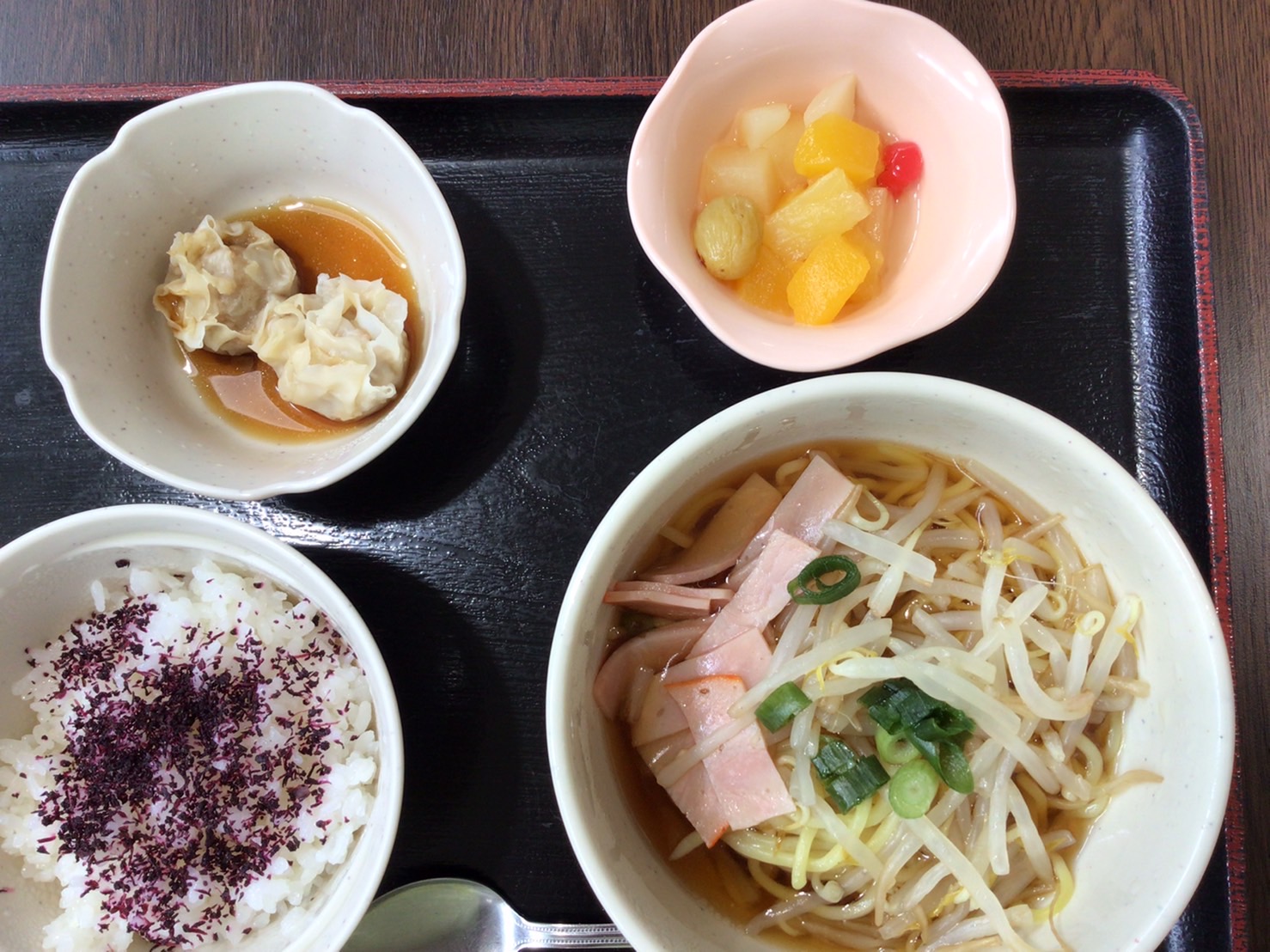 【昼食】 1.ゆかりご飯 2.醤油ラーメン 3.蒸シューマイ 4.フルーツカクテル 658kcal 蛋白質17.3g 脂質5.2g 食塩1.6g