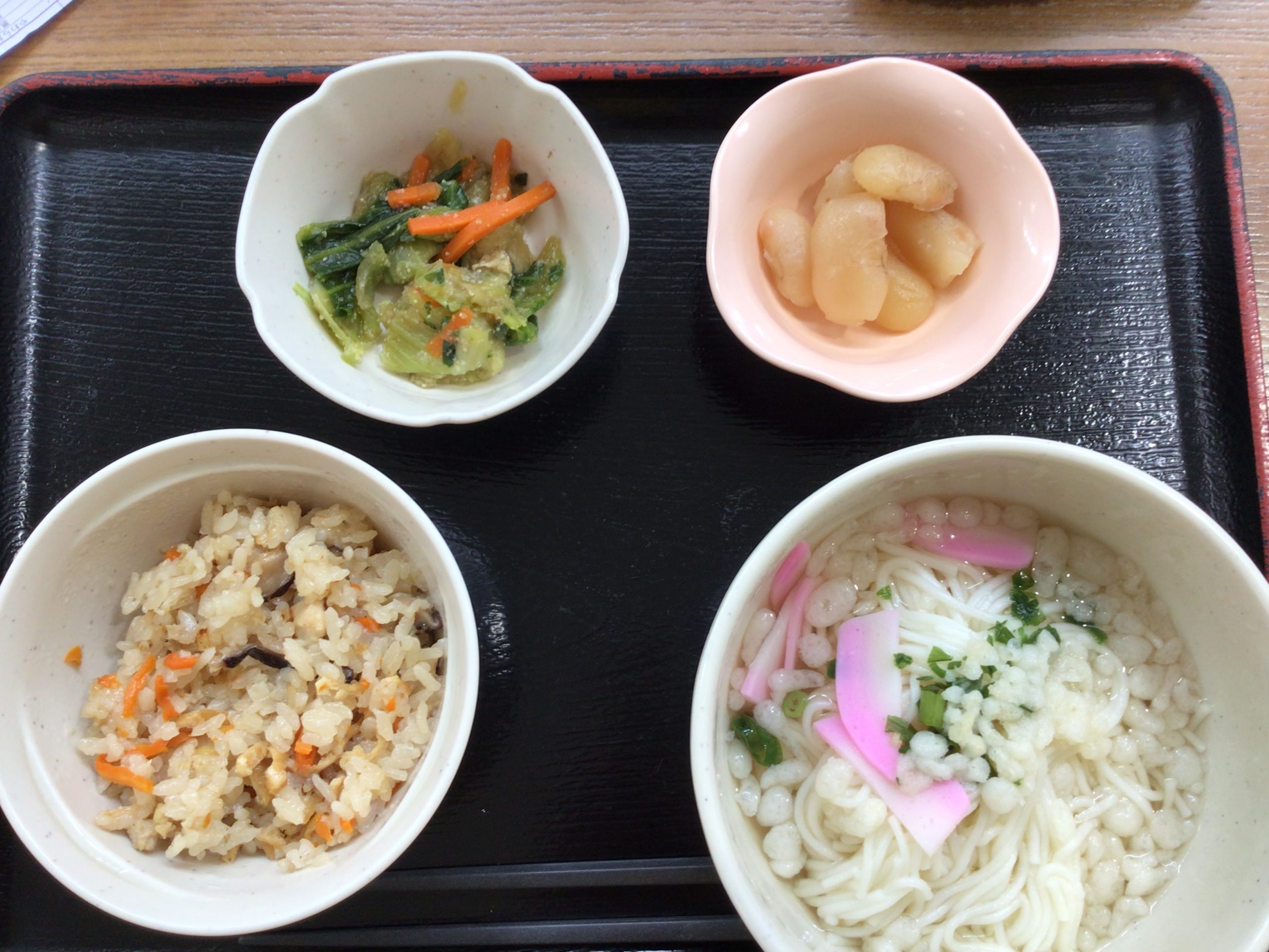 【昼食】 1.かやくご飯 2.にゅう麺 3.青梗菜のごま和え 4.白花豆 607kcal 蛋白質15.1g 脂質3.0g 食塩3.7g