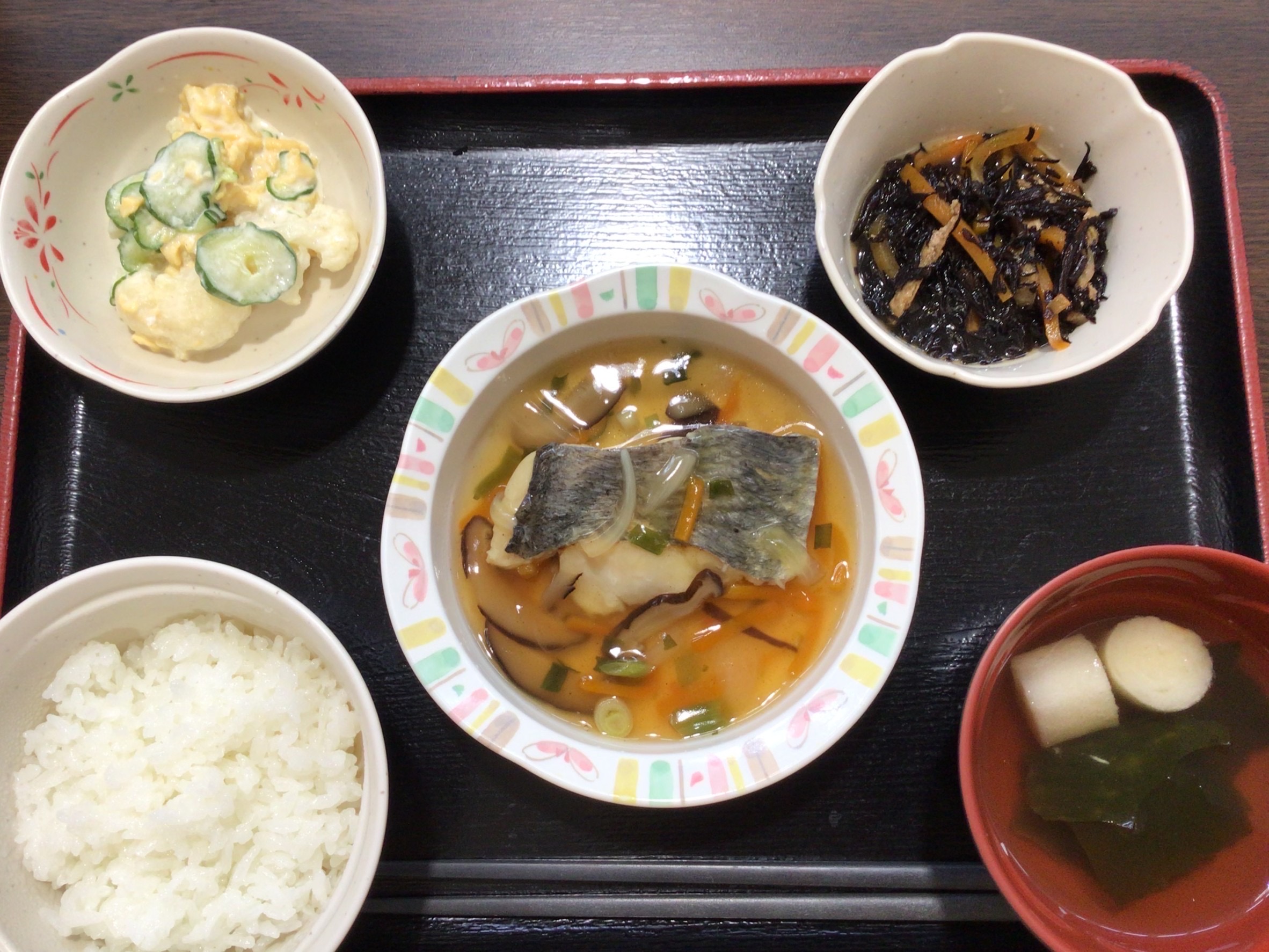 【昼食】 1.米飯 2.蒸し魚のあんかけ 3.カリフラワーと卵のマヨ和え 4.ひじき煮 5.すまし汁 528kcal 蛋白質19.5g 脂質8.7g 食塩2.9g