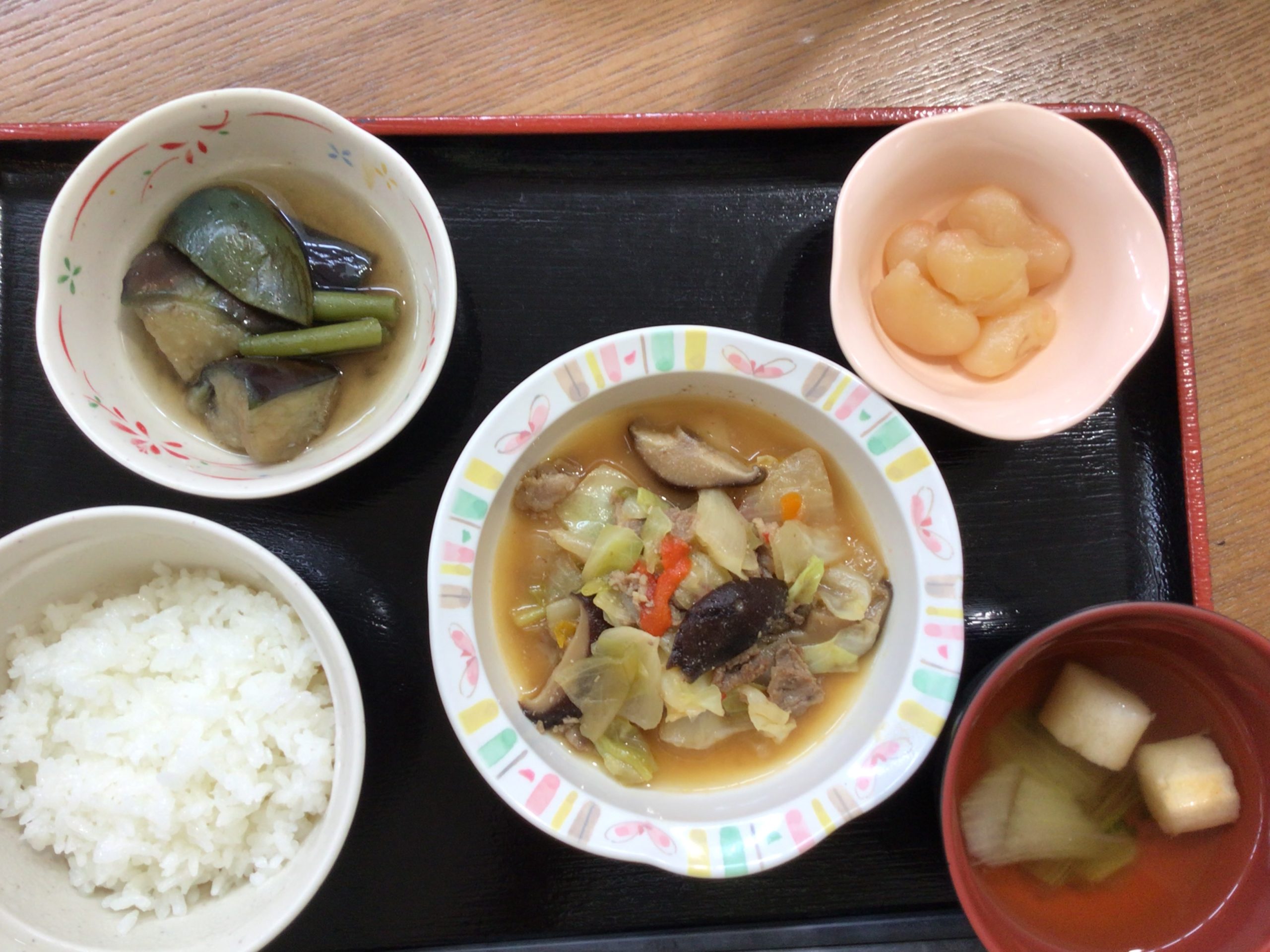 【昼食】 1.米飯 2.豚肉と野菜の味噌炒め 3.なすの煮物 4.白花豆 5.すまし汁 681kcal 蛋白質20.1g 脂質18.2g 食塩3.6g