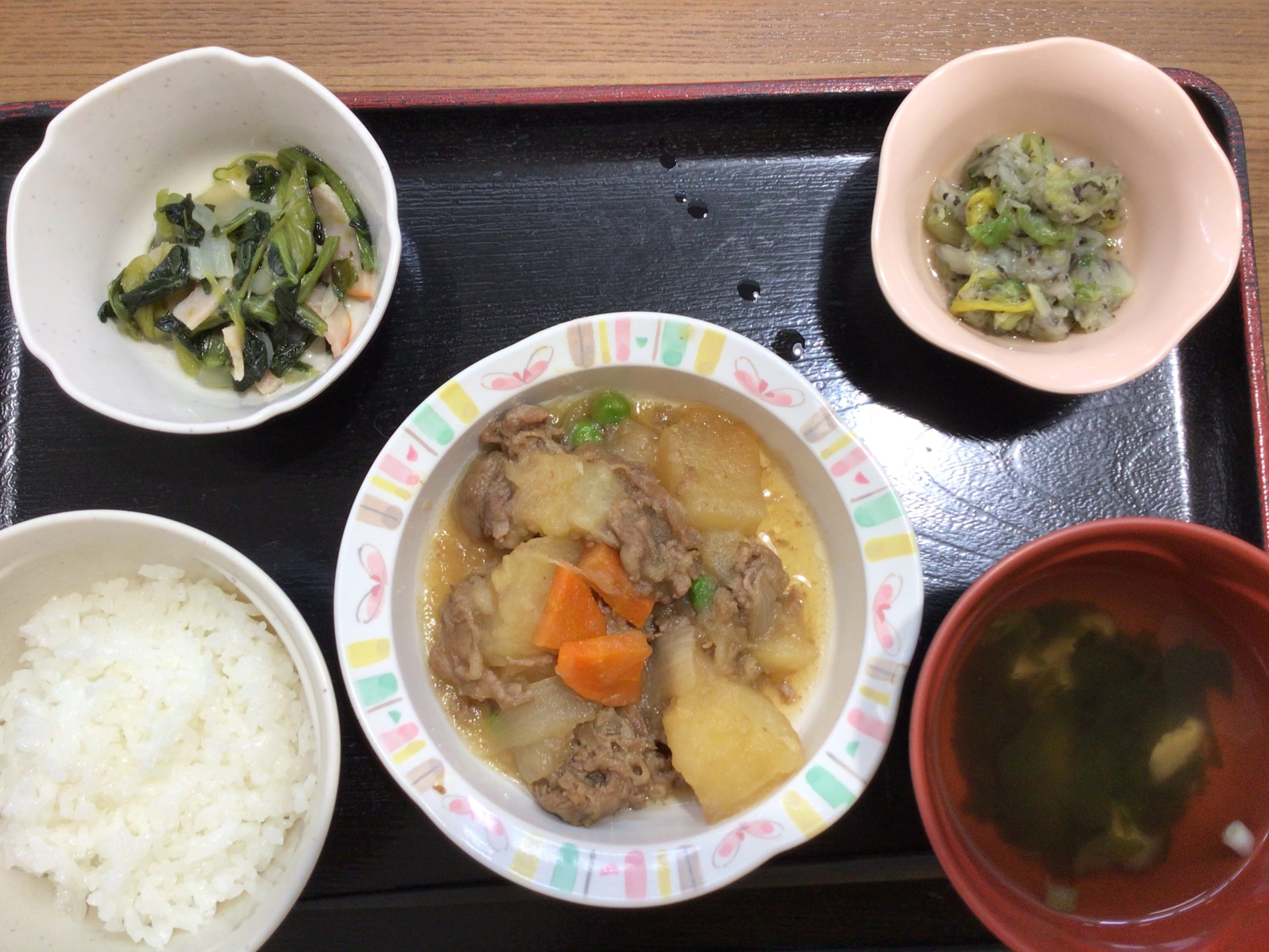 【昼食】 1.米飯 2.肉じゃが 3.小松菜とハムソテー 4.白菜ゆかり和え 5.すまし汁 547kcal 蛋白質16.7g 脂質6.5g 食塩4.5g