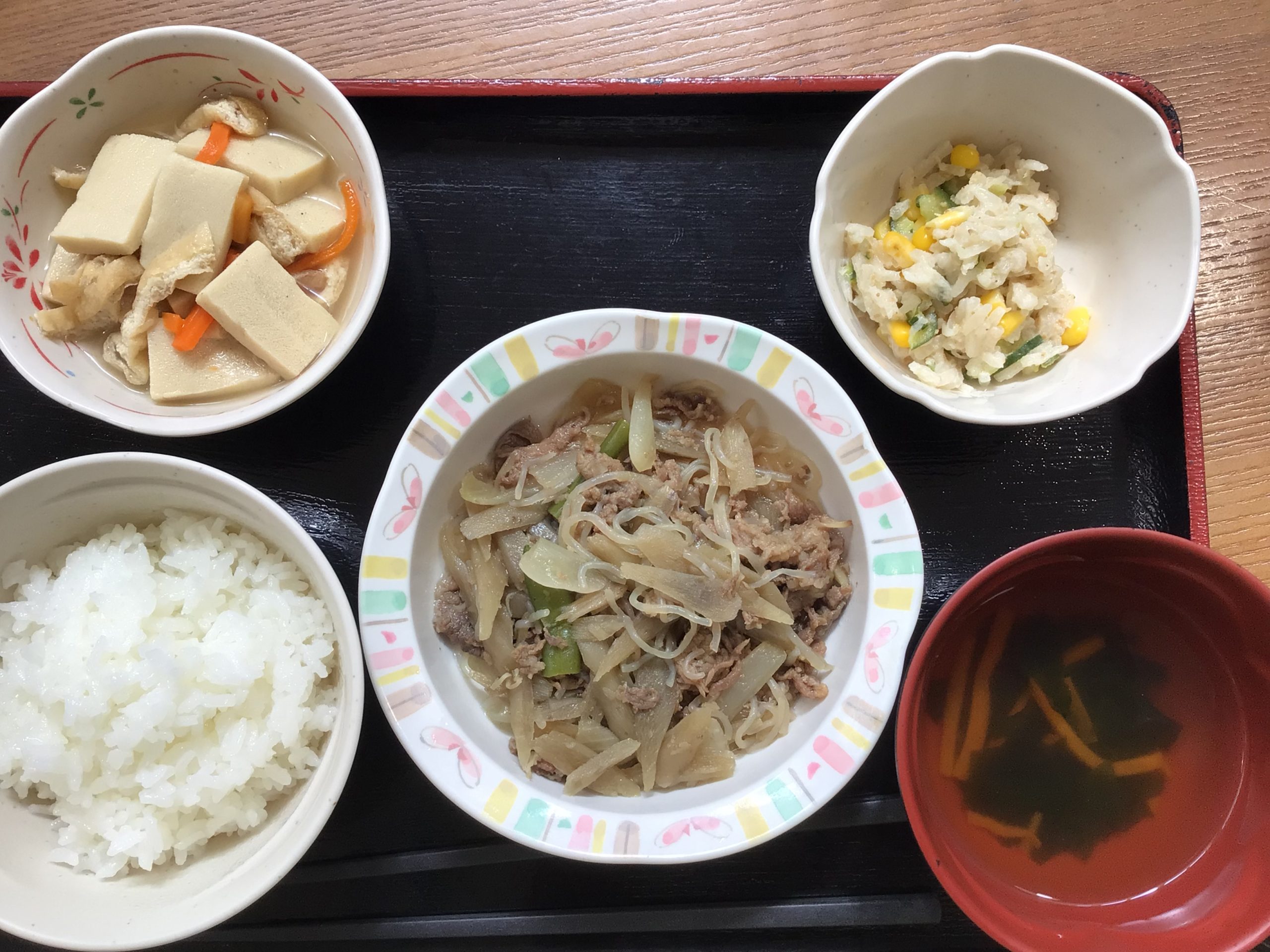 【昼食】 1.米飯 2.牛肉とごぼうのしぐれ煮 3.高野の短冊煮 4.切干大根のサラダ 5.すまし汁 601kcal 蛋白質19.7g 脂質7.4g 食塩4.2g