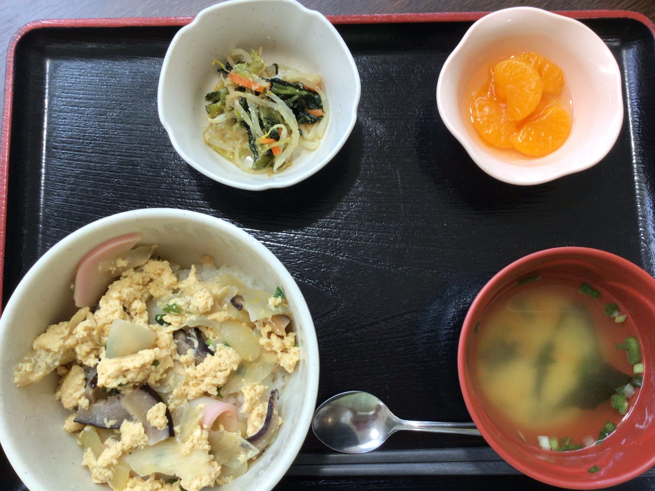 【昼食】 1.木の葉丼 2.ナムル 3.みかん缶 538kcal 蛋白質16.1g 脂質8.5g 食塩2.8g