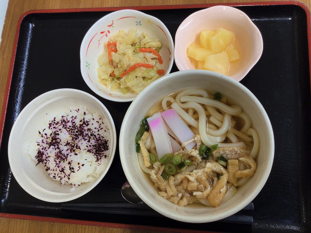 【昼食】 1.ゆかりご飯 2.きざみうどん 3.キャベツのごま和え 4.パイン缶 606kcal 蛋白質14.5g 脂質6.0g 食塩3.5g