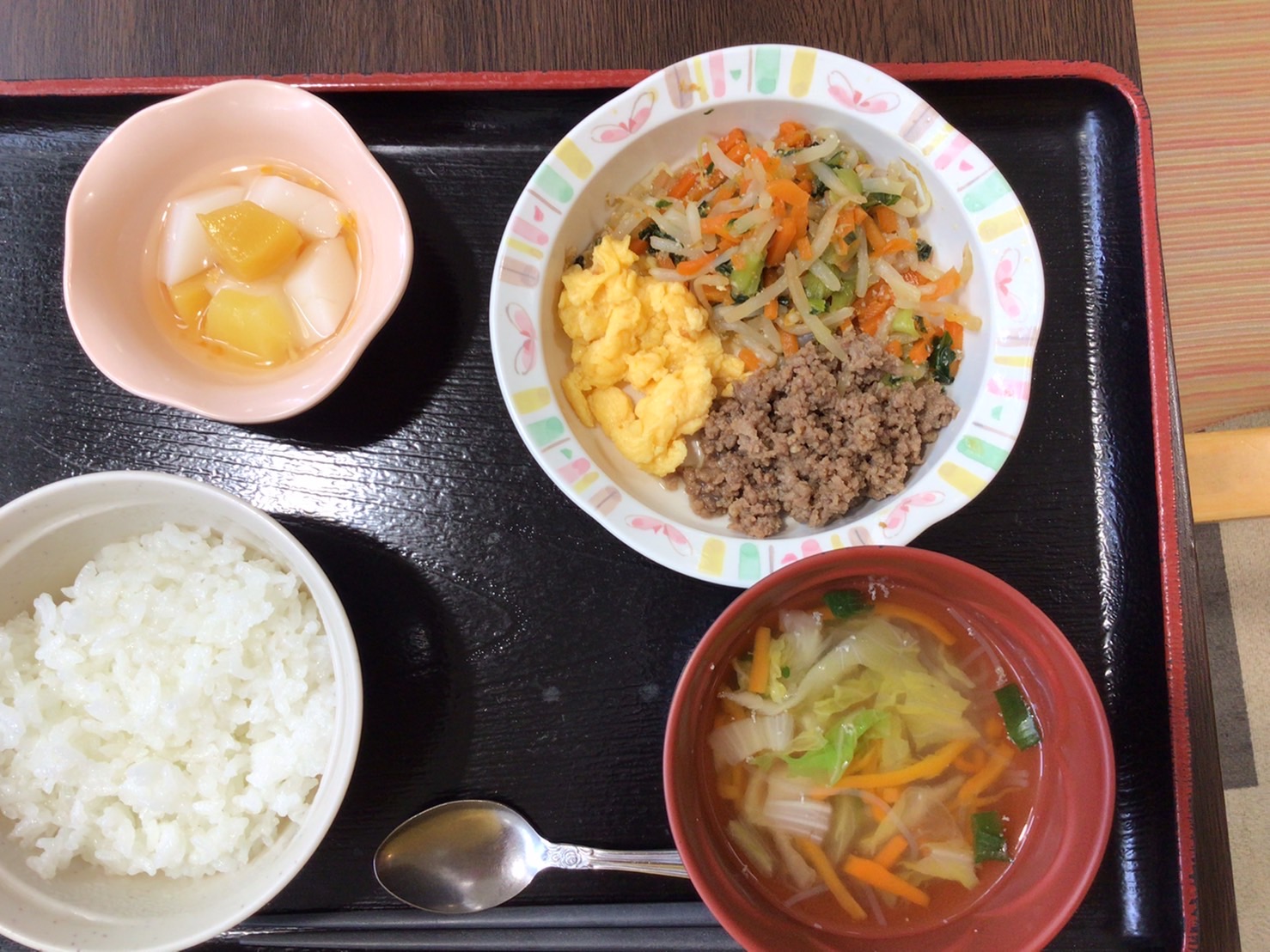 【昼食】 1.ビビンバご飯 2.具だくさん中華スープ 3.フルーツ杏仁豆腐 580kcal 蛋白質15.0g 脂質13.2g 食塩2.0g