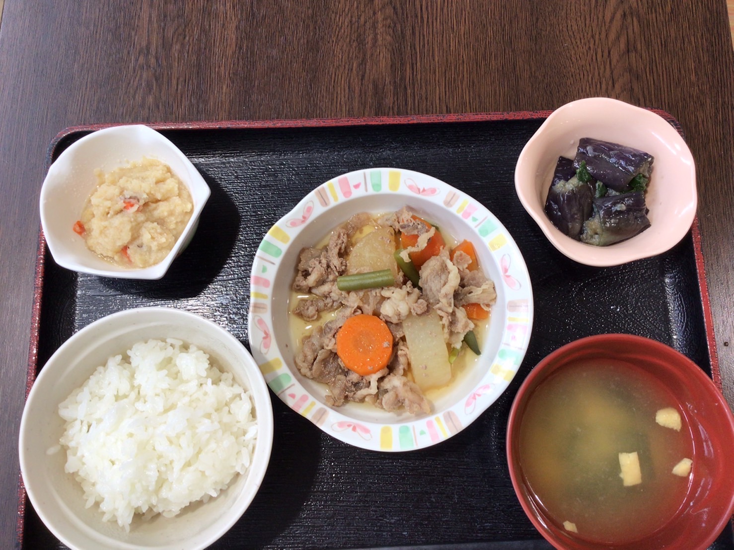 【昼食】 1.米飯 2.豚と大根の煮物 3.なす生姜醤油和え 4.うの花 5.みそ汁 611kcal 蛋白質18.4g 脂質17.8g 食塩3.1g