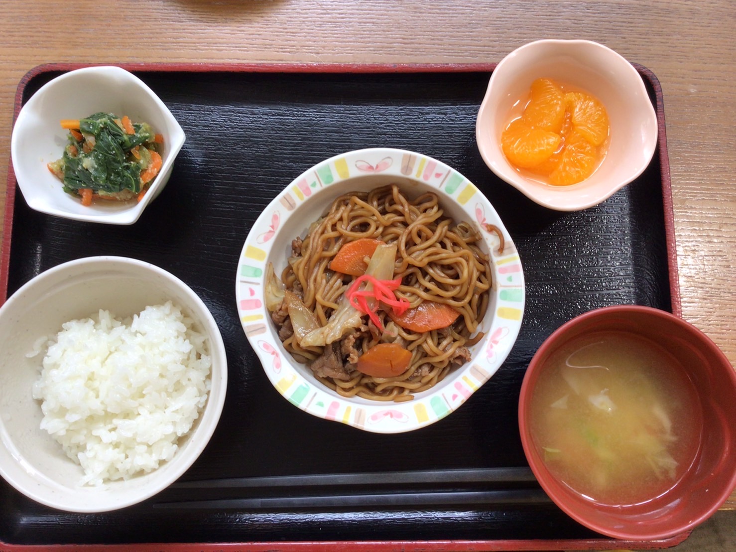 【昼食】 1.米飯 2.焼きそば 3.青梗菜のごま和え 4.みかん缶 5.みそ汁 592kcal 蛋白質15.3g 脂質8.0g 食塩2.7g