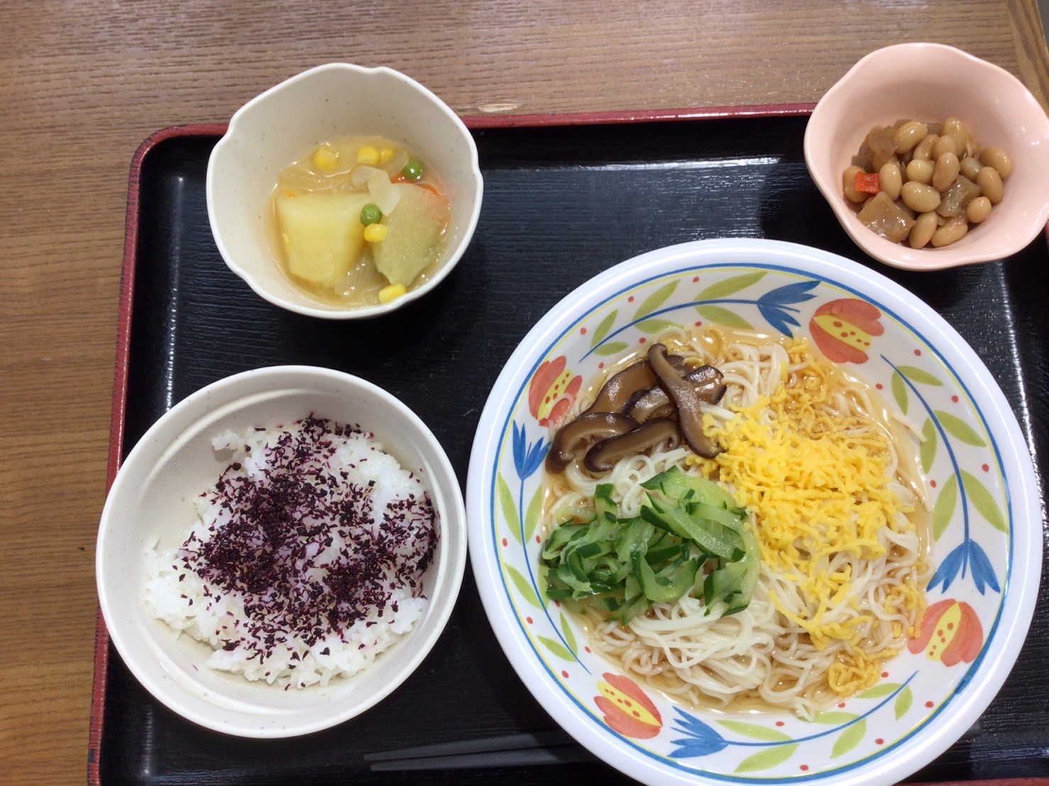 【昼食】 1.ゆかりご飯 2.冷やしそうめん 3.じゃが芋コンソメ煮 4.野菜豆煮 584kcal 蛋白質16.6g 脂質4.9g 食塩3.4g