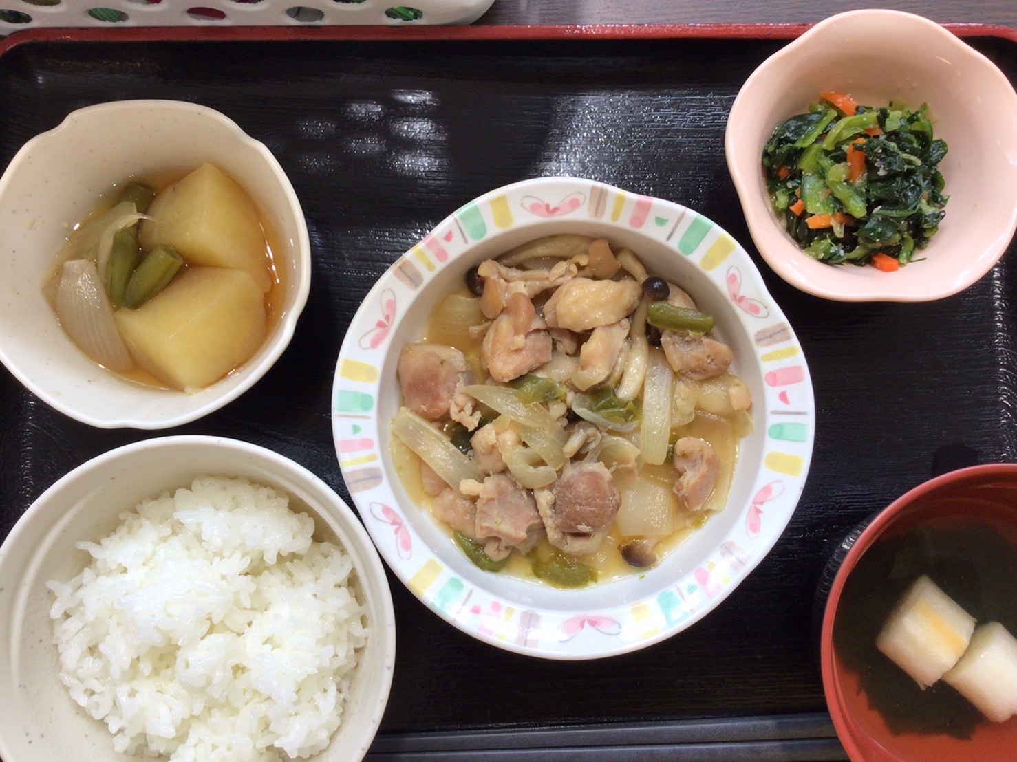 【昼食】 1.米飯 2.鶏の甘辛炒め 3.じゃが芋の煮物 4.小松菜のごま和え 5.すまし汁 599kcal 蛋白質19.7g 脂質12.4g 食塩4.6g