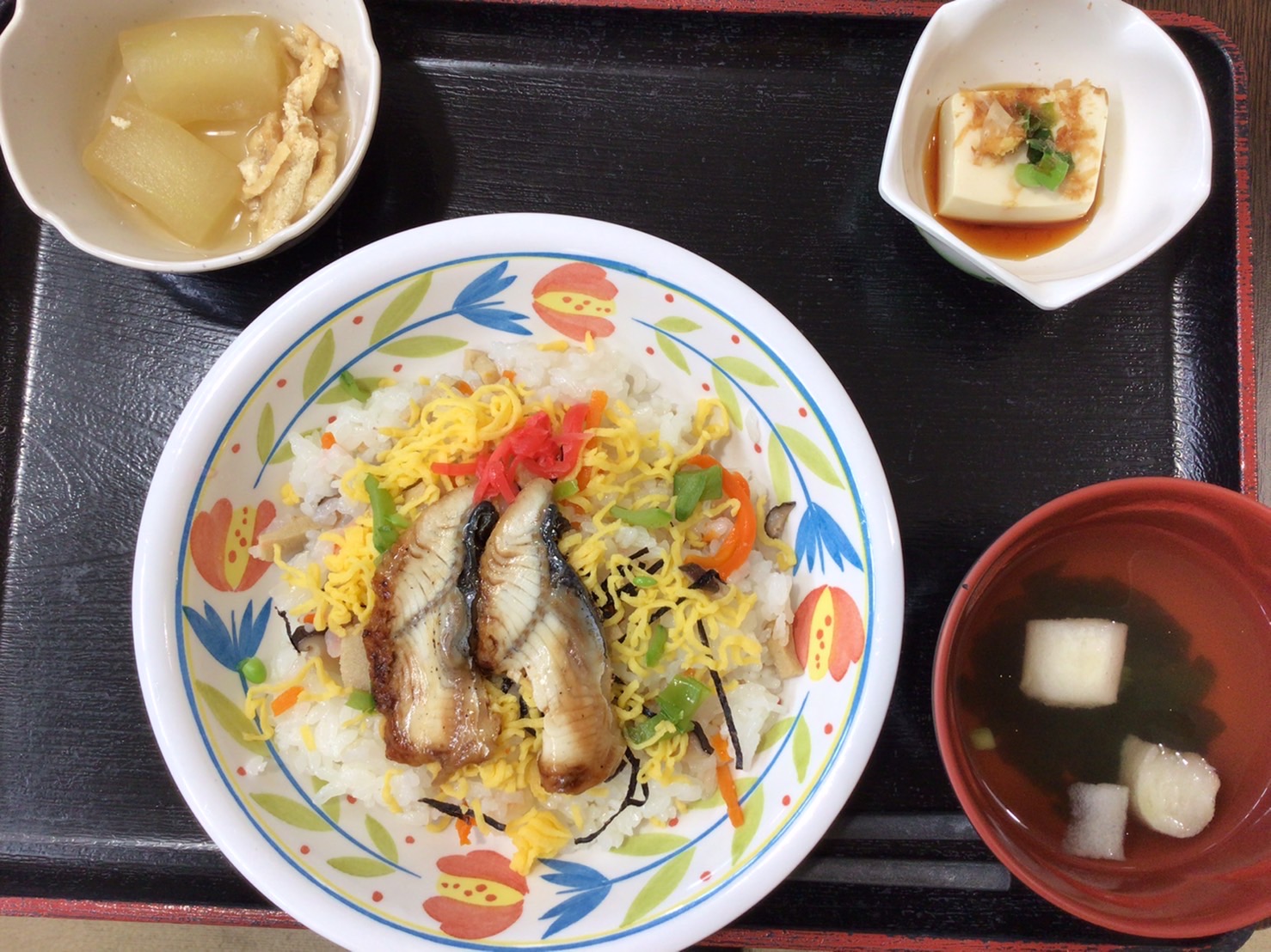 【昼食】 1.うなぎチラシ 2.とうがん煮 3.冷奴 4.すまし汁 566kcal 蛋白質17.3g 脂質8.6g 食塩5.6g