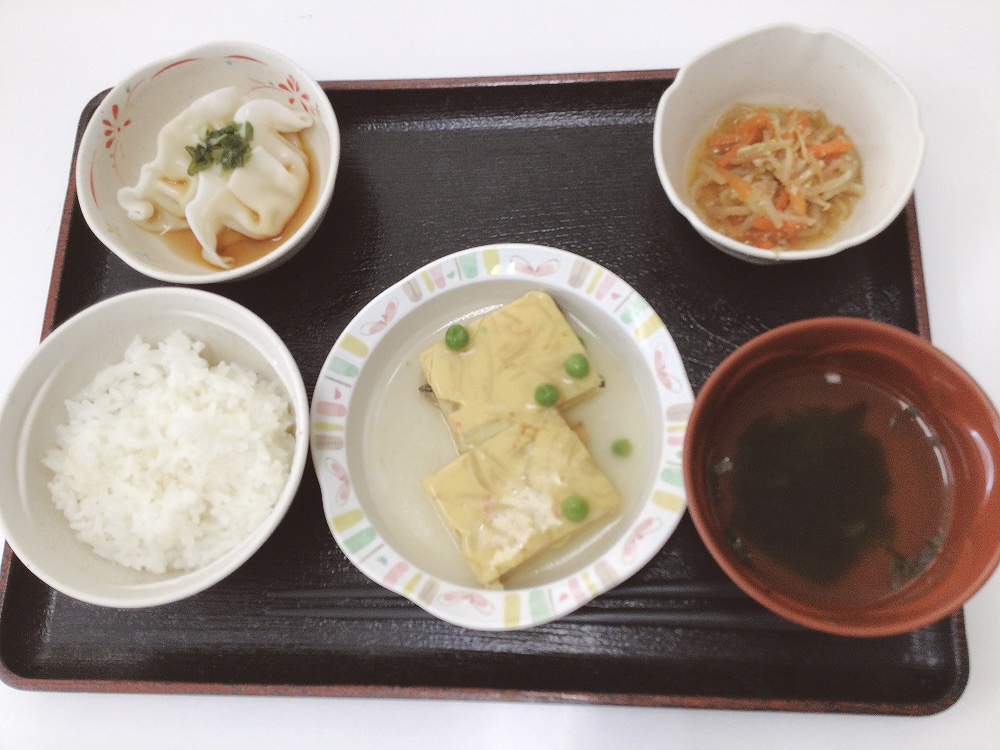 【昼食】 1.米飯 2.かに玉風 3.水餃子ねぎポン酢 4.ナムル 5.中華風スープ 574kcal 蛋白質19.8g 脂質10.9g 食塩3.1g