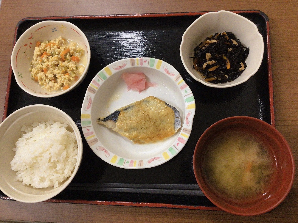 【昼食】 1.米飯 2.さわら味噌マヨネーズ焼き 3.炒り豆腐 4.ひじき煮 5.みそ汁 631kcal 蛋白質23.1g 脂質17.6g 食塩2.7g