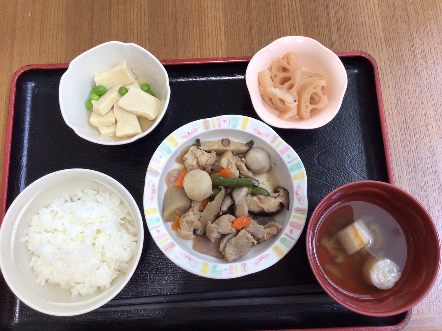 【昼食】 1.米飯 2.炒り鶏 3.高野豆腐の煮物 4.レンコン甘酢和え 5.すまし汁 603kcal 蛋白質20.0g 脂質10.1g 食塩3.2g