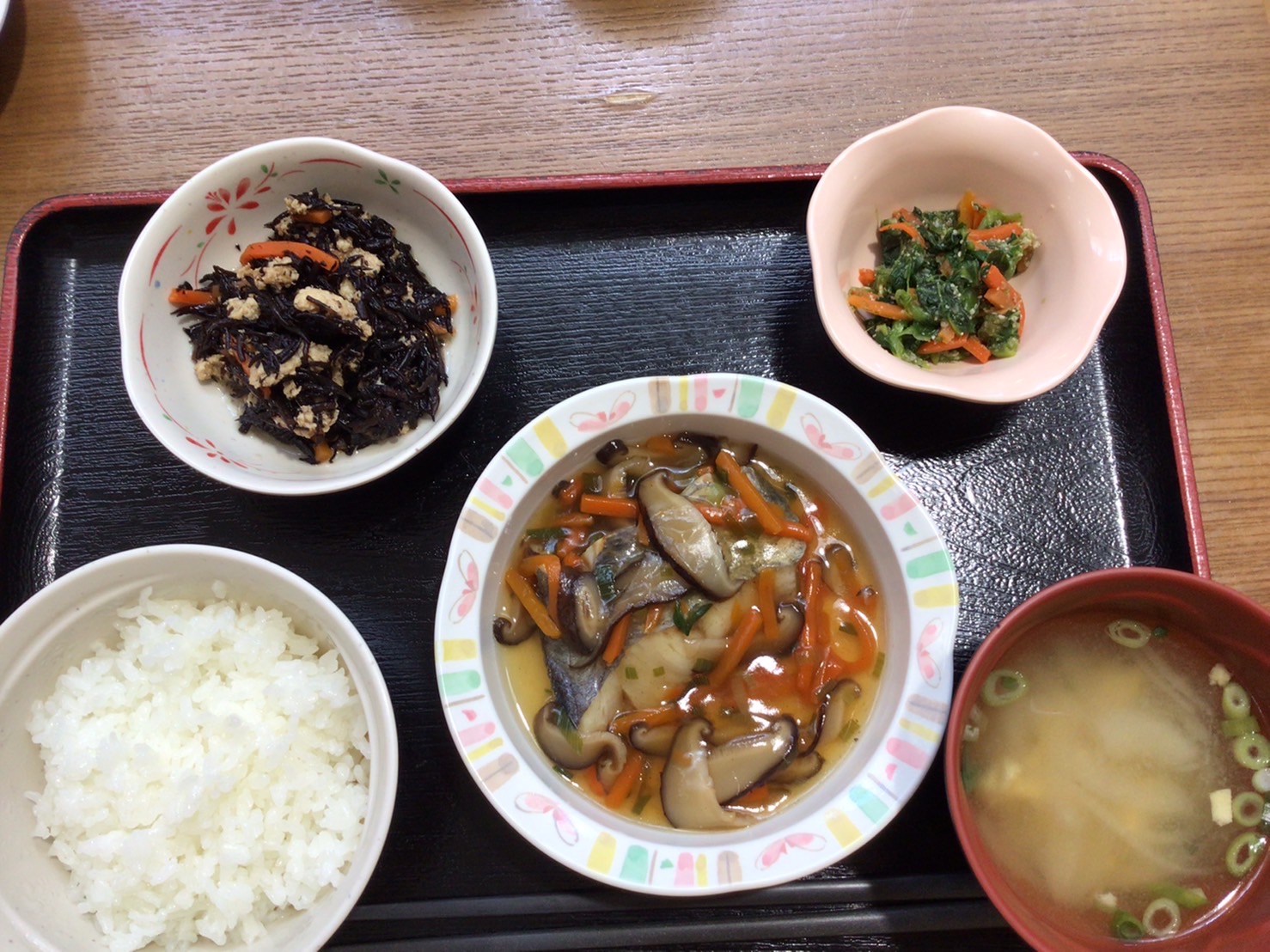 【昼食】 1.米飯 2.蒸し魚あんかけ 3.鶏ひじき煮 4.ナムル 5.みそ汁 498kcal 蛋白質20.6g 脂質4.7g 食塩2.6g