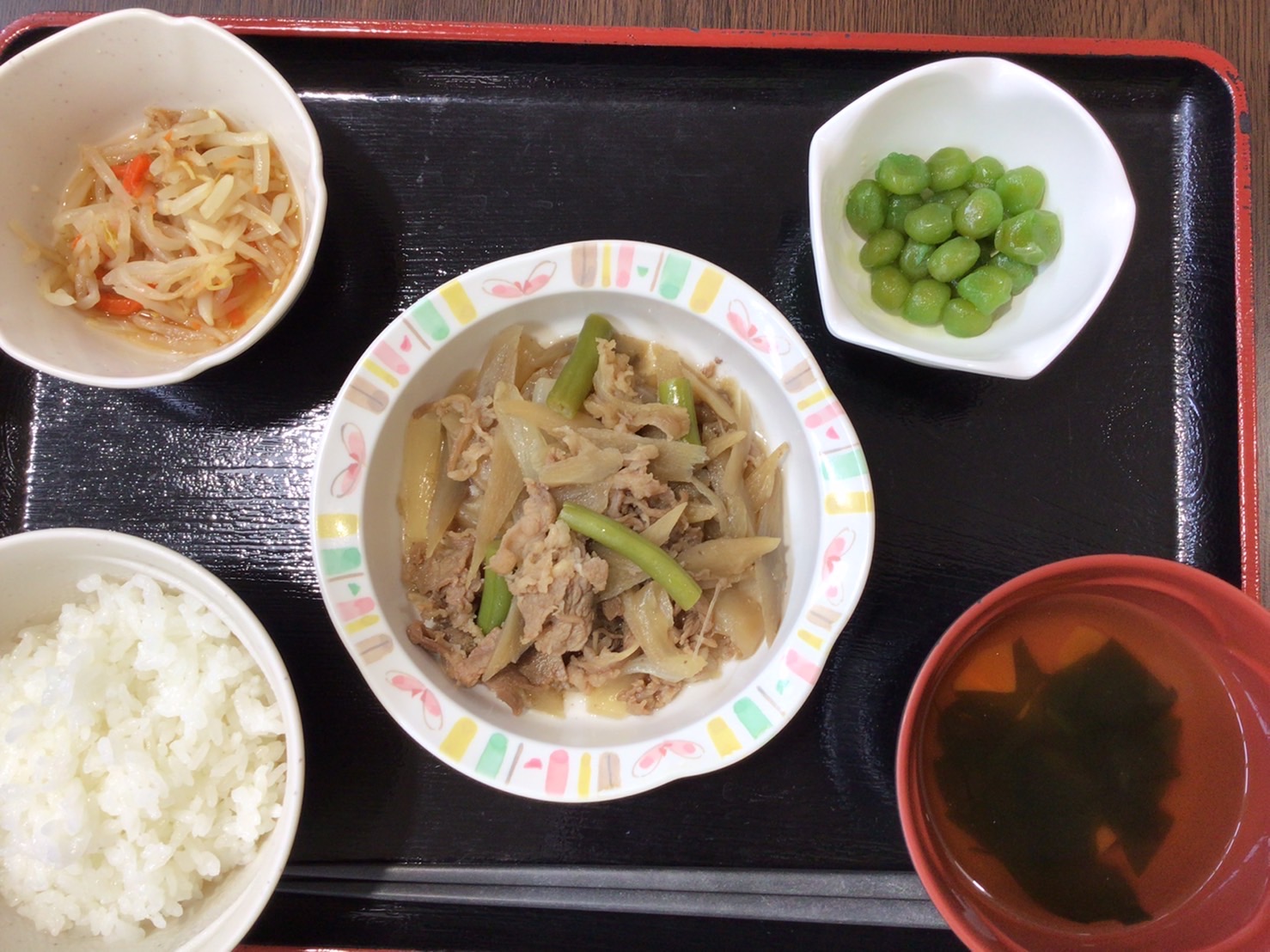 【昼食】 1.米飯 2.牛肉とごぼうのしぐれ煮 3.もやしのお浸し 4.うぐいす豆 5.すまし汁 526kcal 蛋白質16.2g 脂質3.9g 食塩3.6g