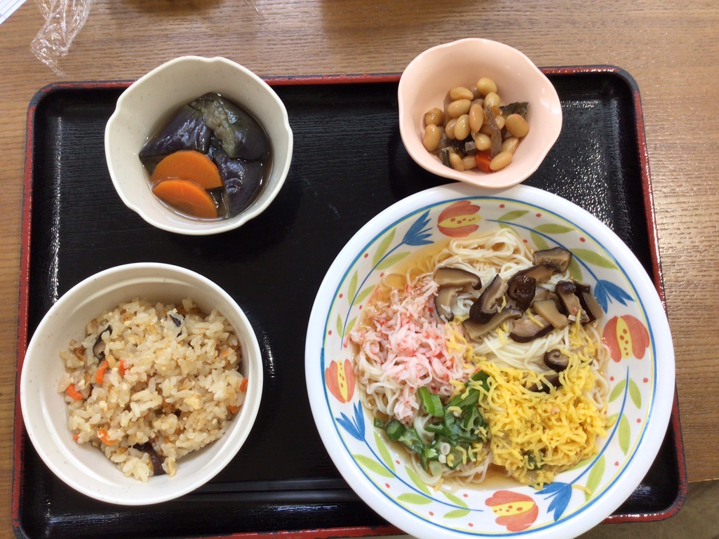 【昼食】 1.炊き込みご飯 2.七夕そうめん 3.なすの煮物 4.野菜豆煮 681kcal 蛋白質19.9g 脂質12.9g 食塩4.1g