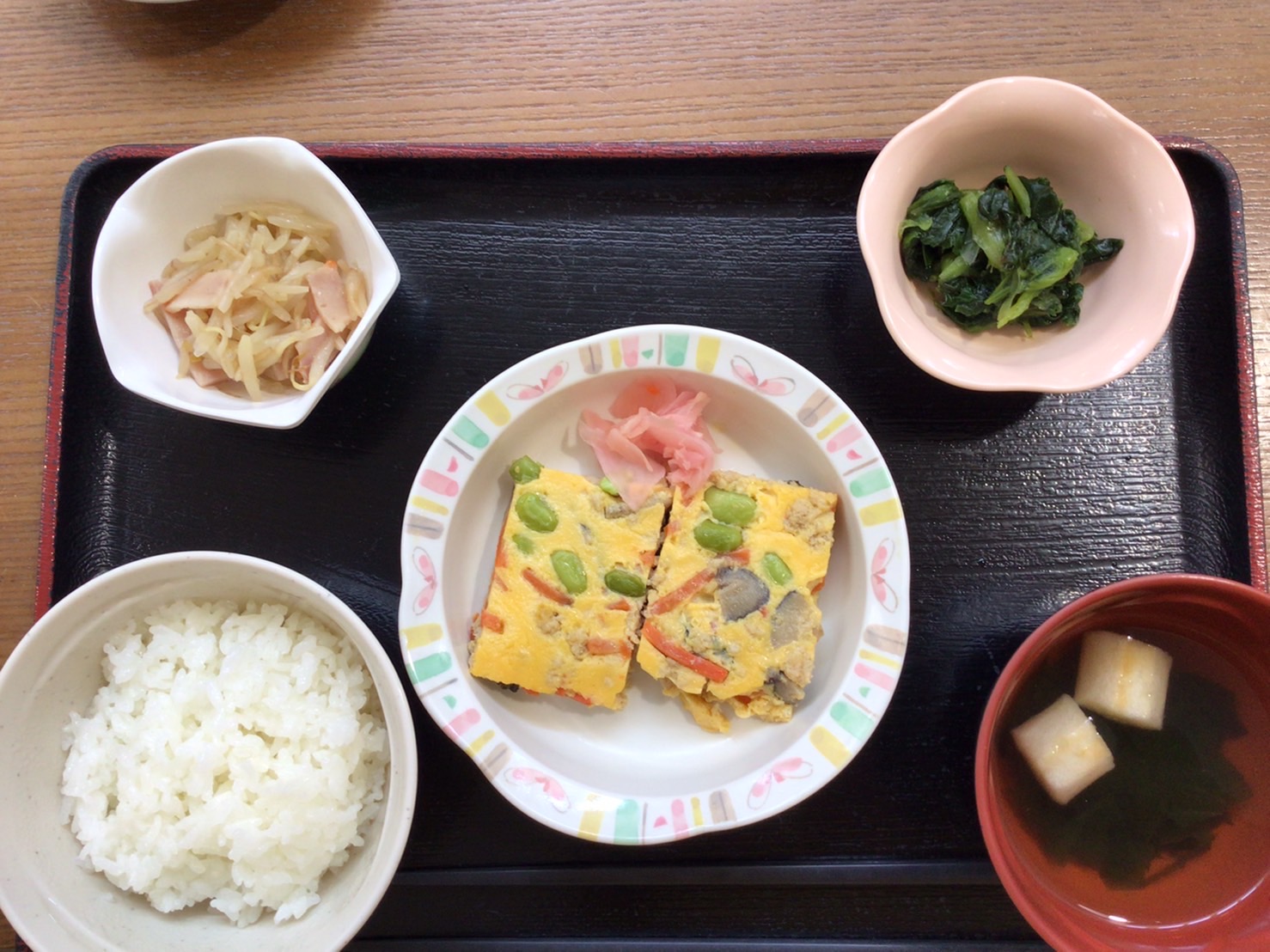 【昼食】 1.米飯 2.千草焼き 3.もやしとハム炒め 4.こまつなのお浸し 5.すまし汁 588kcal 蛋白質21.7g 脂質12.8g 食塩4.5g