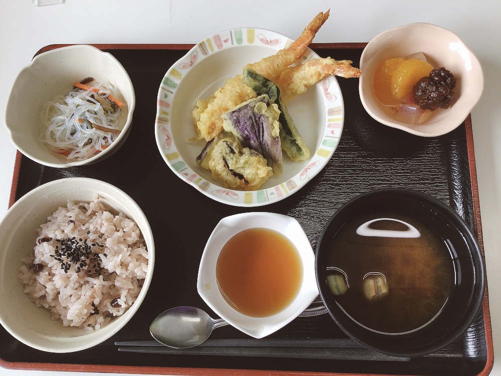 【昼食】 1.赤飯 2.天ぷら盛り合わせ 3.春雨サラダ 4.赤だし 5.デザート 485kcal 蛋白質19.2g 脂質1.9g 食塩3.5g