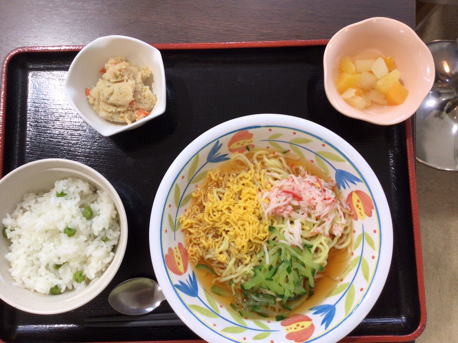 【昼食】 1.豆ご飯 2.冷やし中華 3.うの花 4.フルーツカクテル 609kcal 蛋白質14.5g 脂質5.4g 食塩3.3g