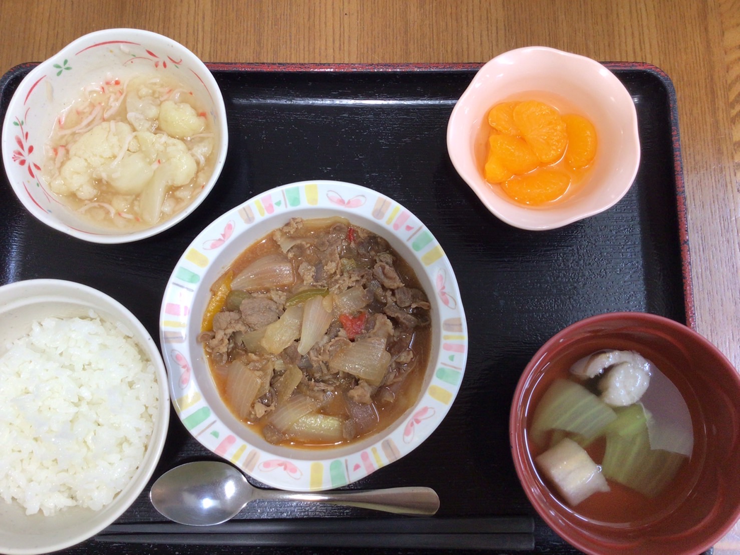 【昼食】 1.米飯 2.ポークチャップ 3.カリフラワーかにあん 4.みかん缶 5.すまし汁 624kcal 蛋白質19.2g 脂質15.6g 食塩3.2g