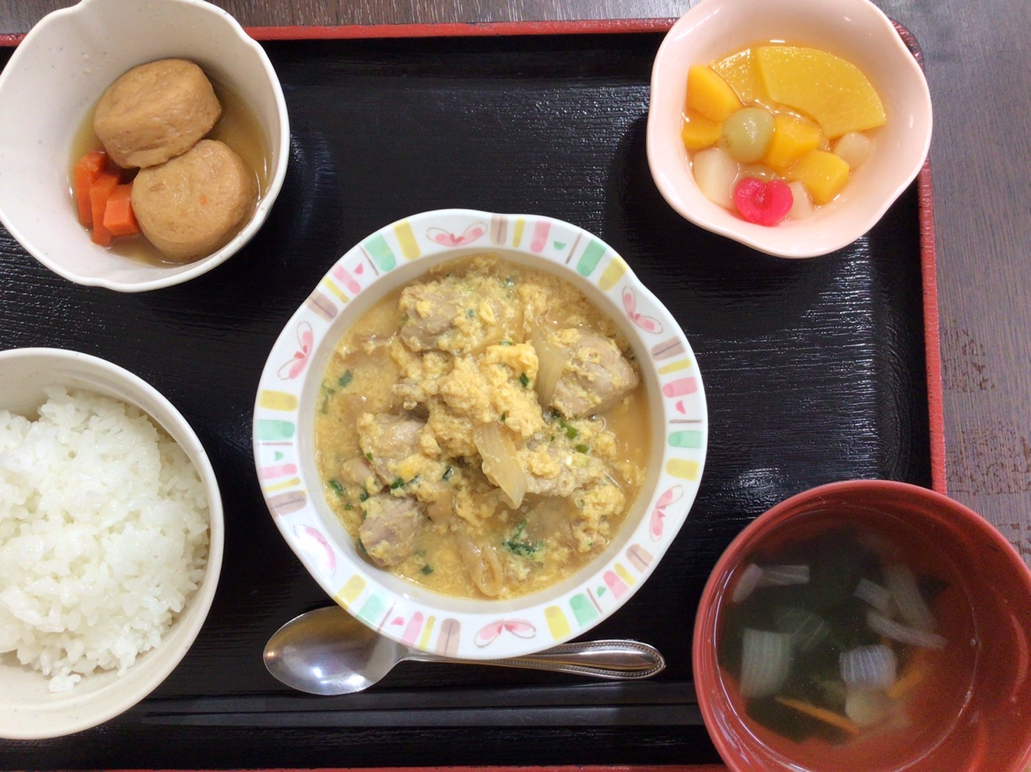 【昼食】 1.米飯 2.甘辛鶏肉の卵とじ 3.がんも煮 4.みかん缶 5.すまし汁 706kcal 蛋白質24.1g 脂質18.4g 食塩3.9g