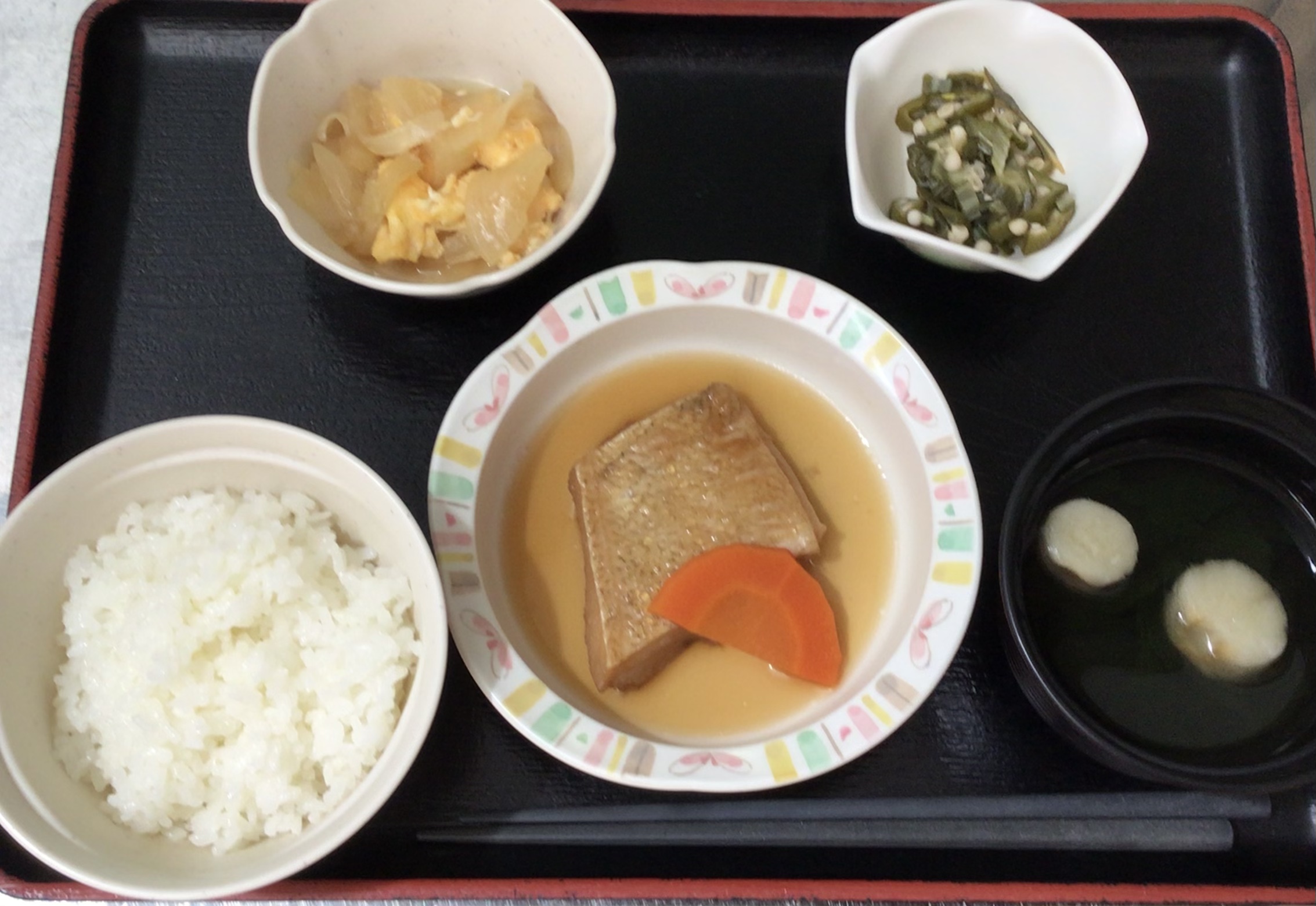 【昼食】 1.米飯 2.煮魚 3.ねぎ玉 4.おくらポン酢 5.すまし汁