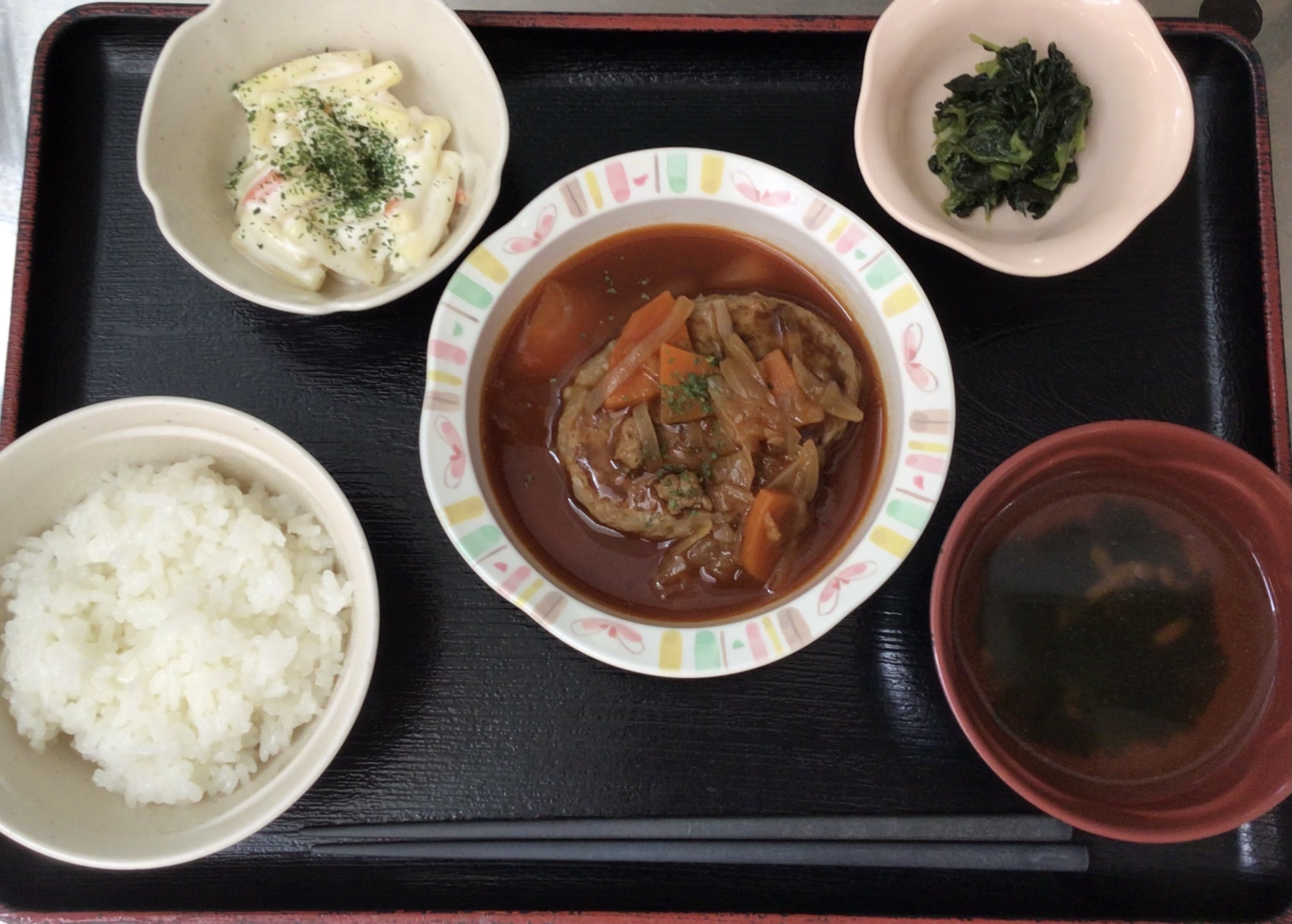 【昼食】 1.米飯 2.煮込みハンバーグ 3.マカロニサラダ 4.ほうれん草ソテー 5.コンソメスープ