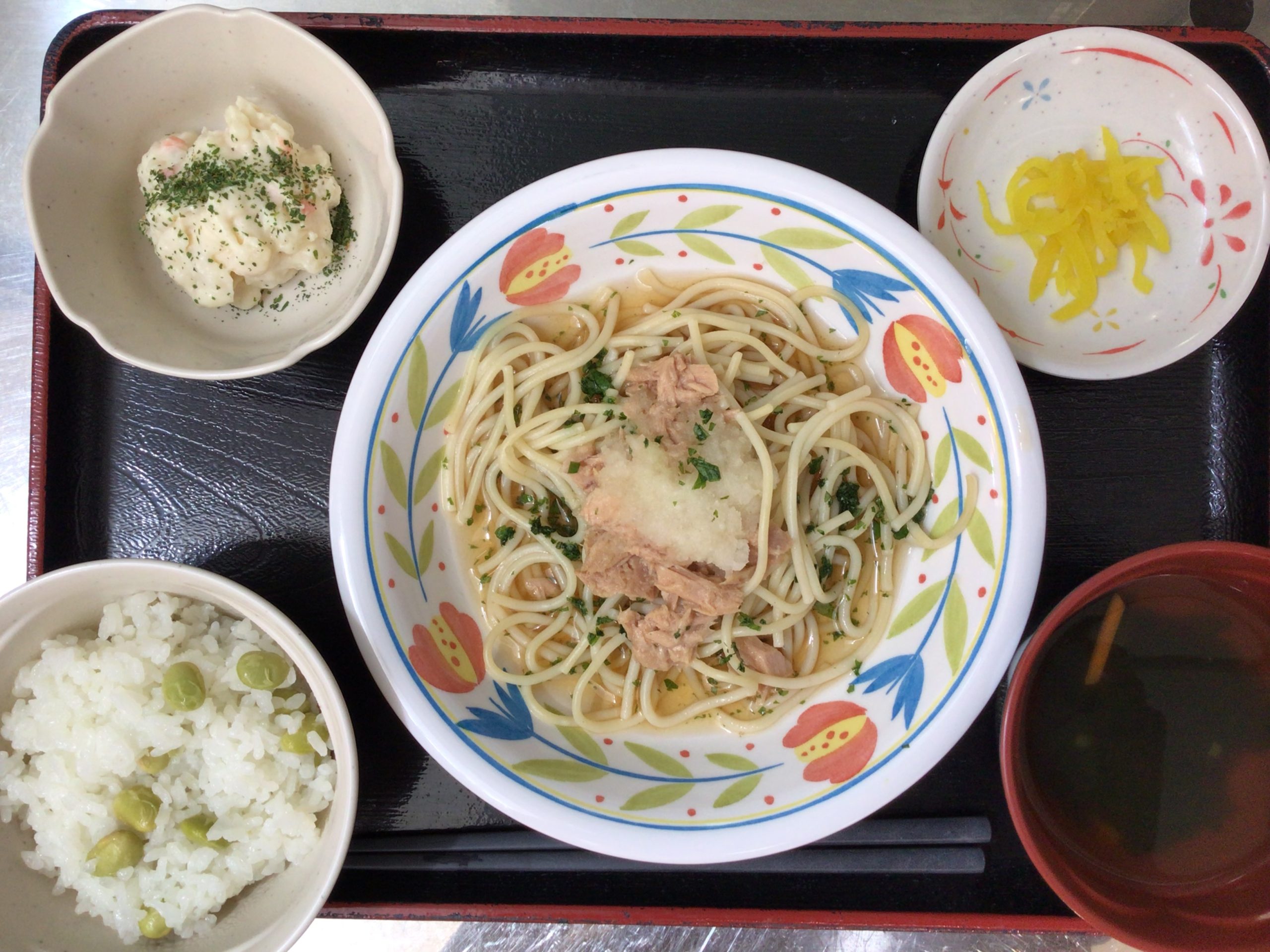 【昼食】 1.枝豆ご飯 2.和風冷製パスタ 3.ポテトサラダ 4.漬物 5.すまし汁