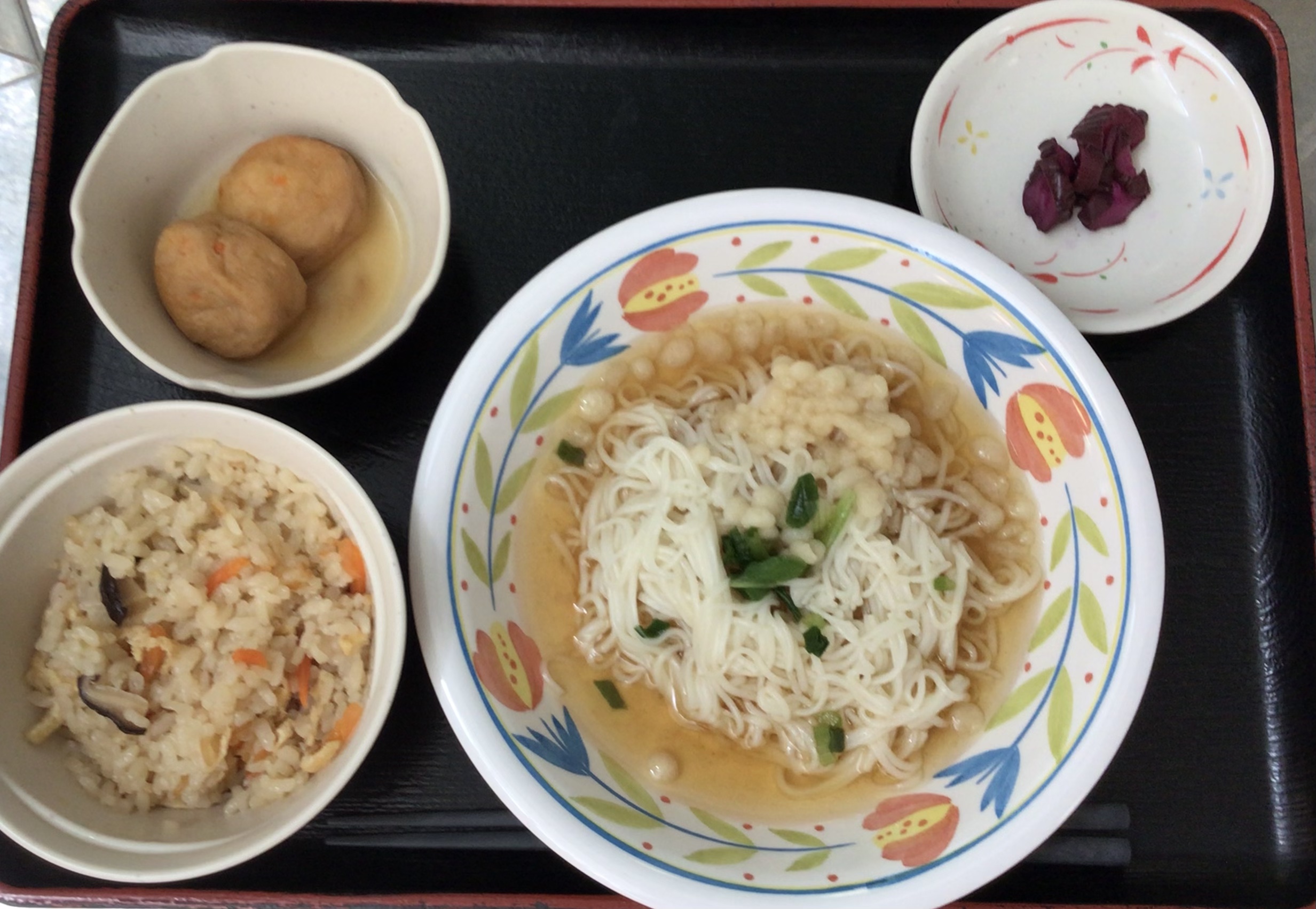 【昼食】 1.かやくご飯(小) 2.ぶっかけそうめん 3.がんも煮 4.漬物